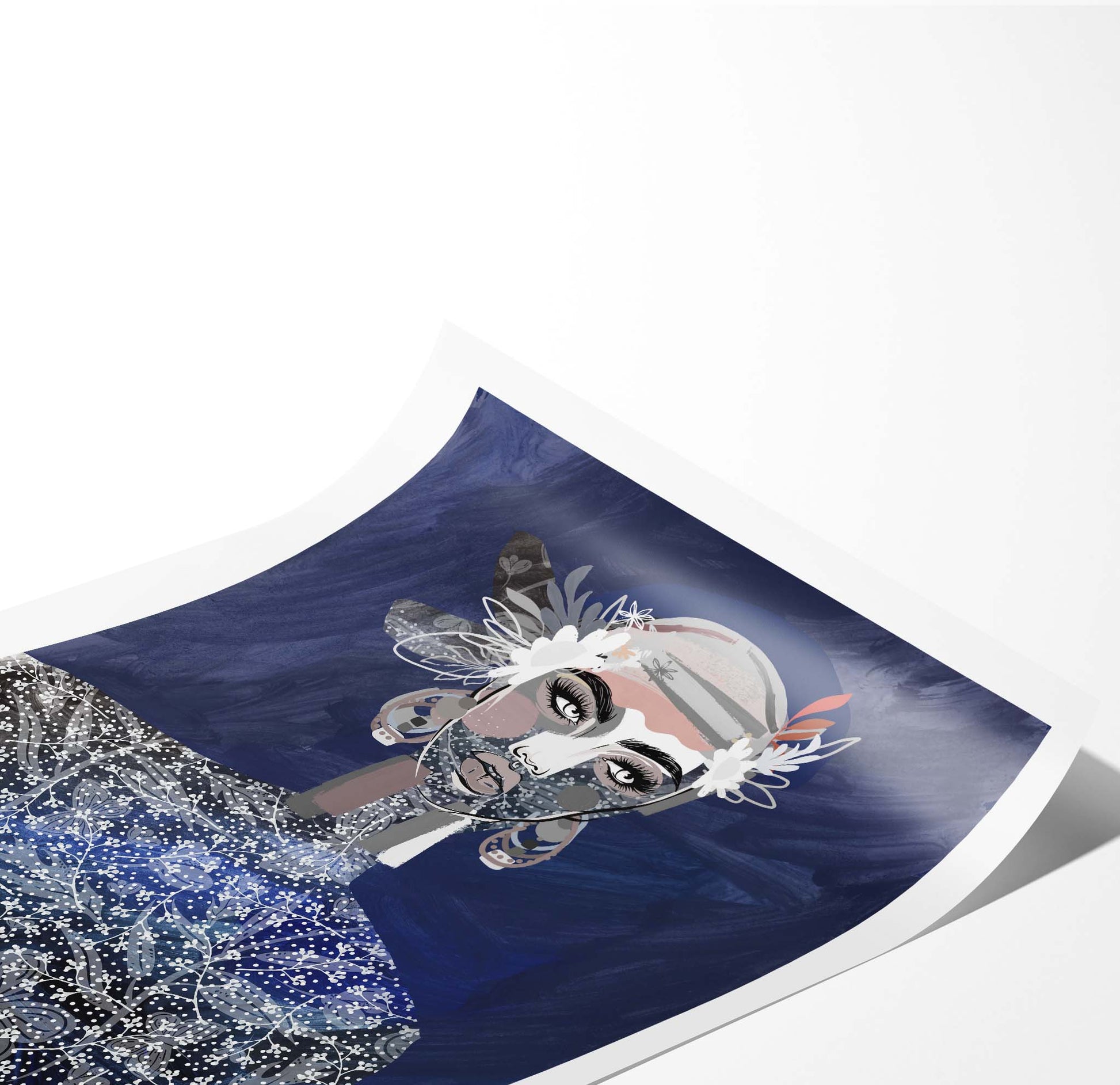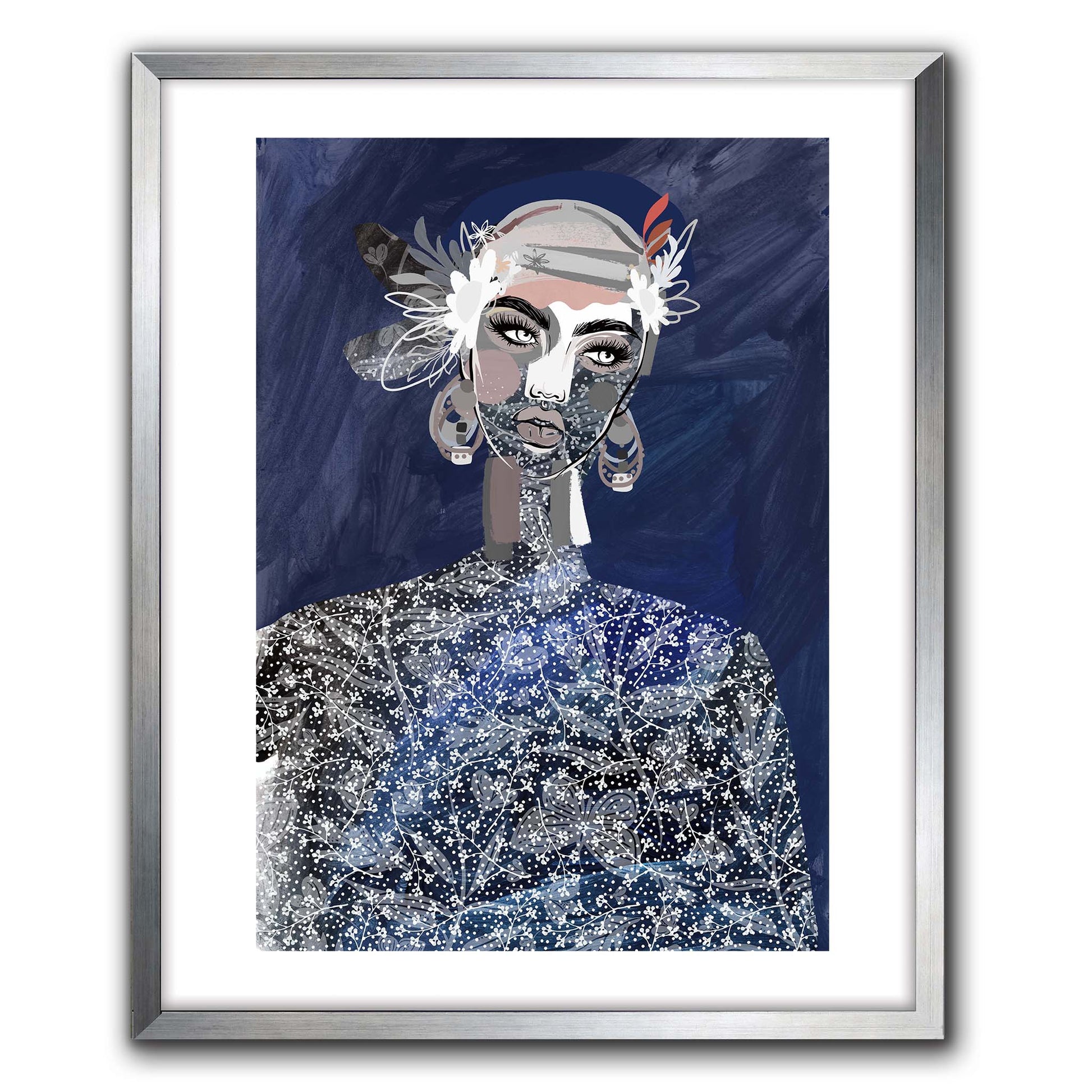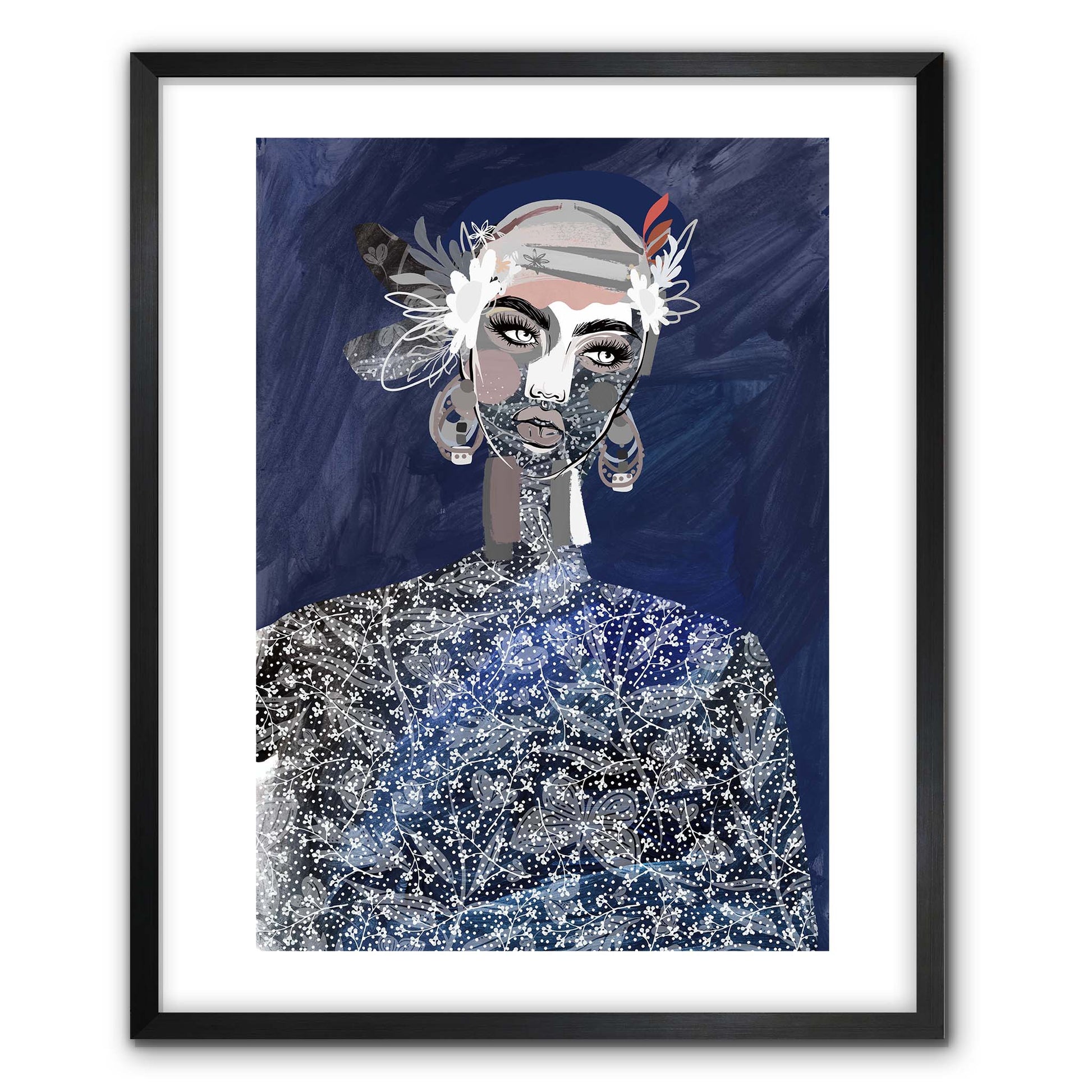 Dreamlike and naive state, Aije contemplates wistfully in deep azure and indigo tones. Adorned with textural jewels, layered accessories and intricate dress, her mood relaxed and peaceful.
