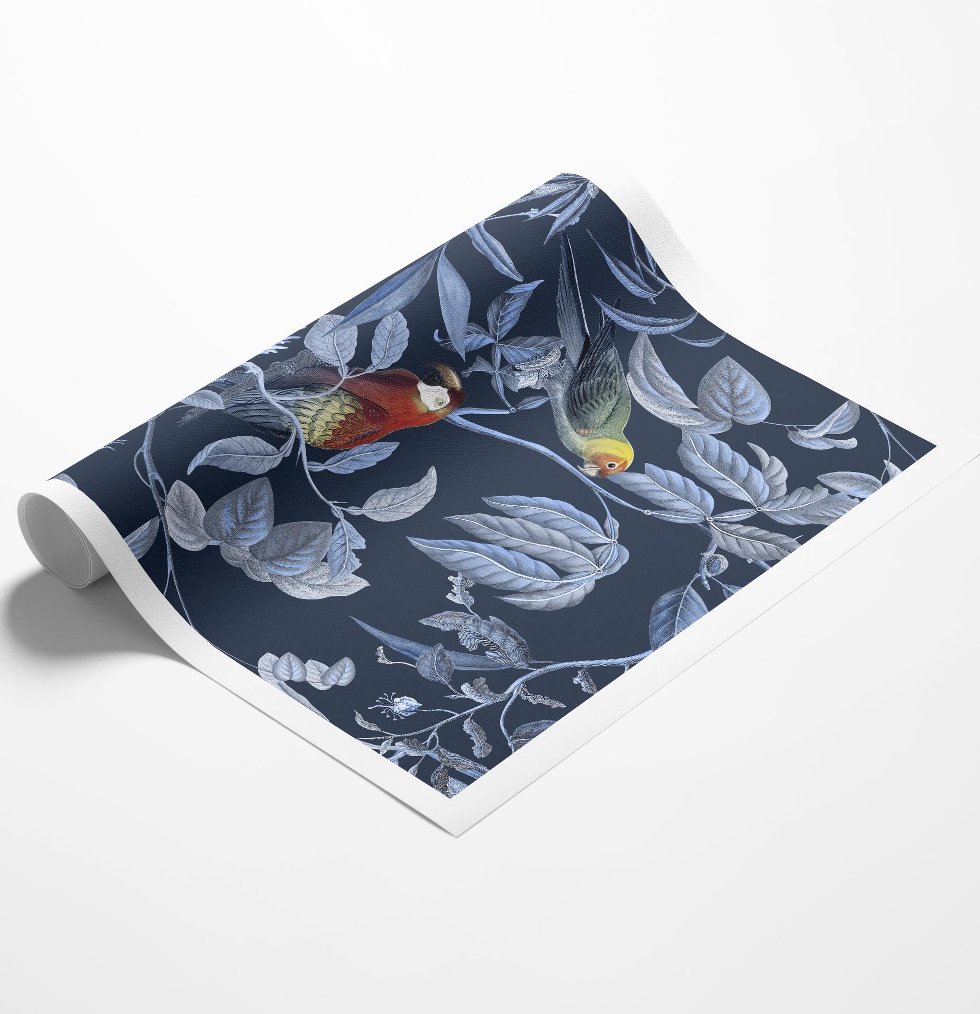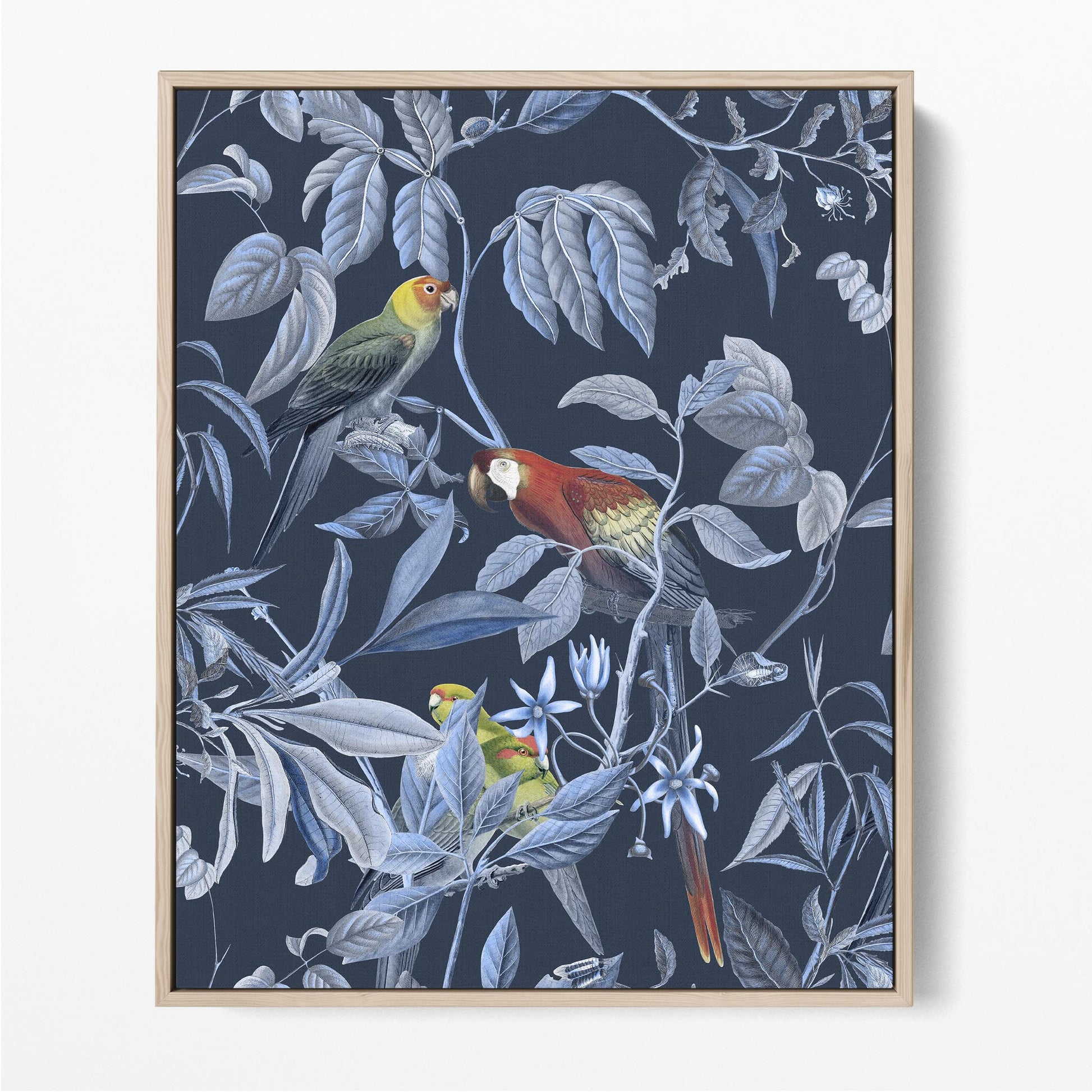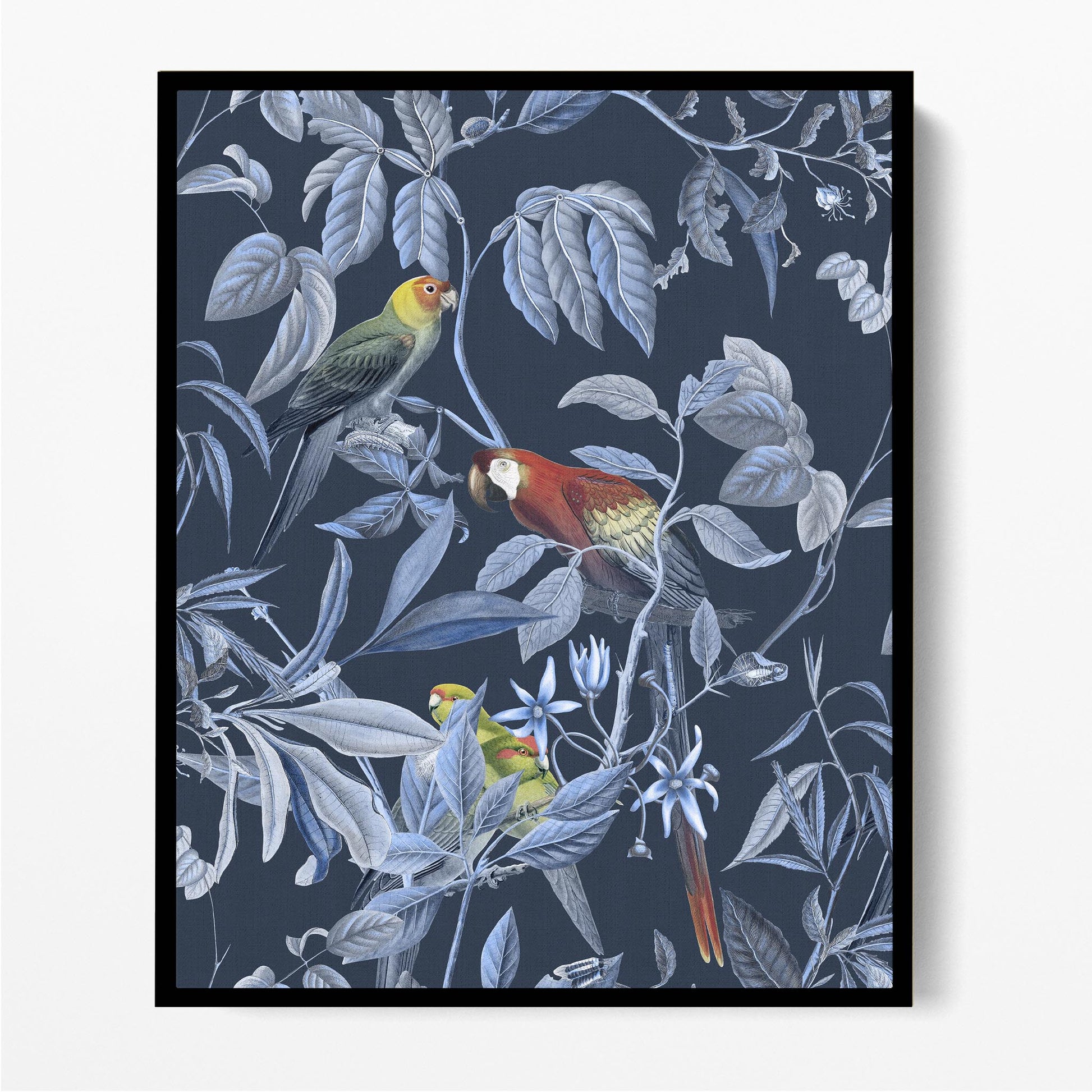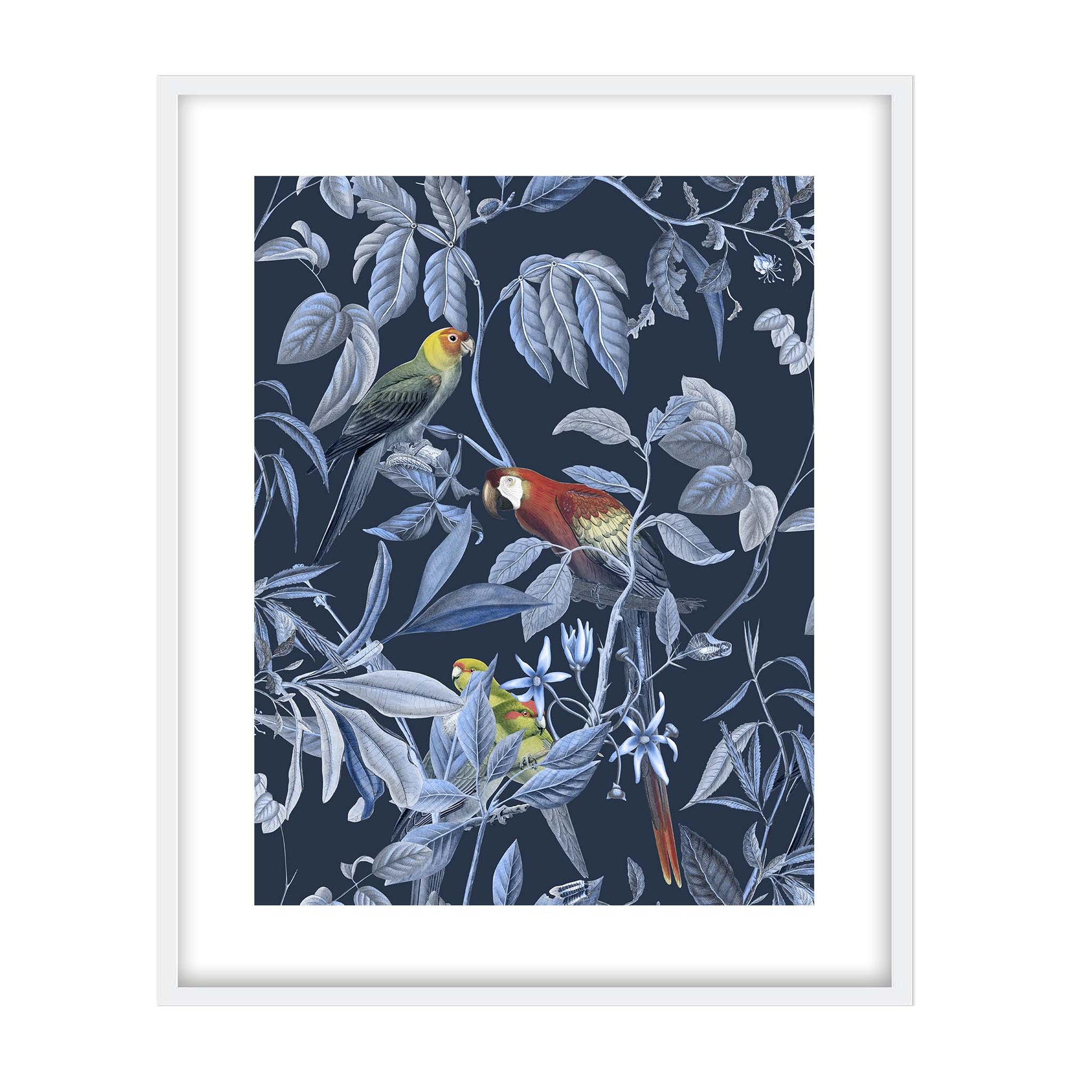 Chic modern contemporary art print. Perched birds in a blue paradise.