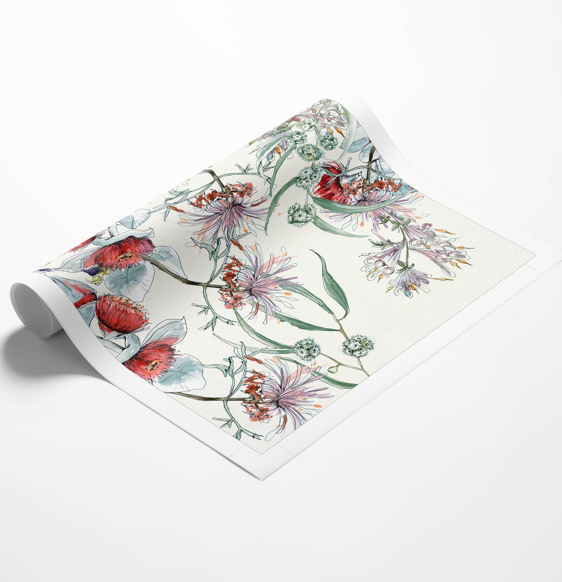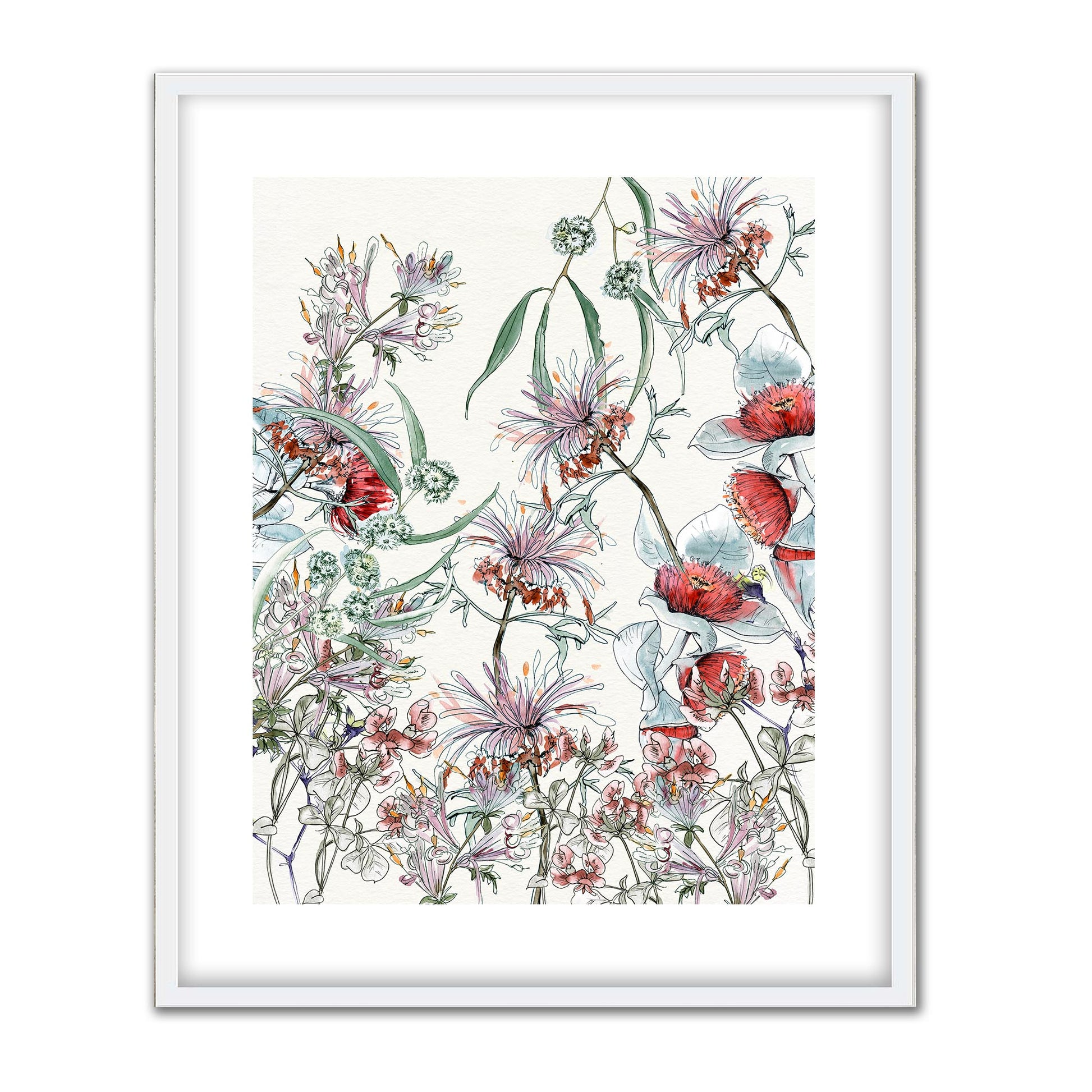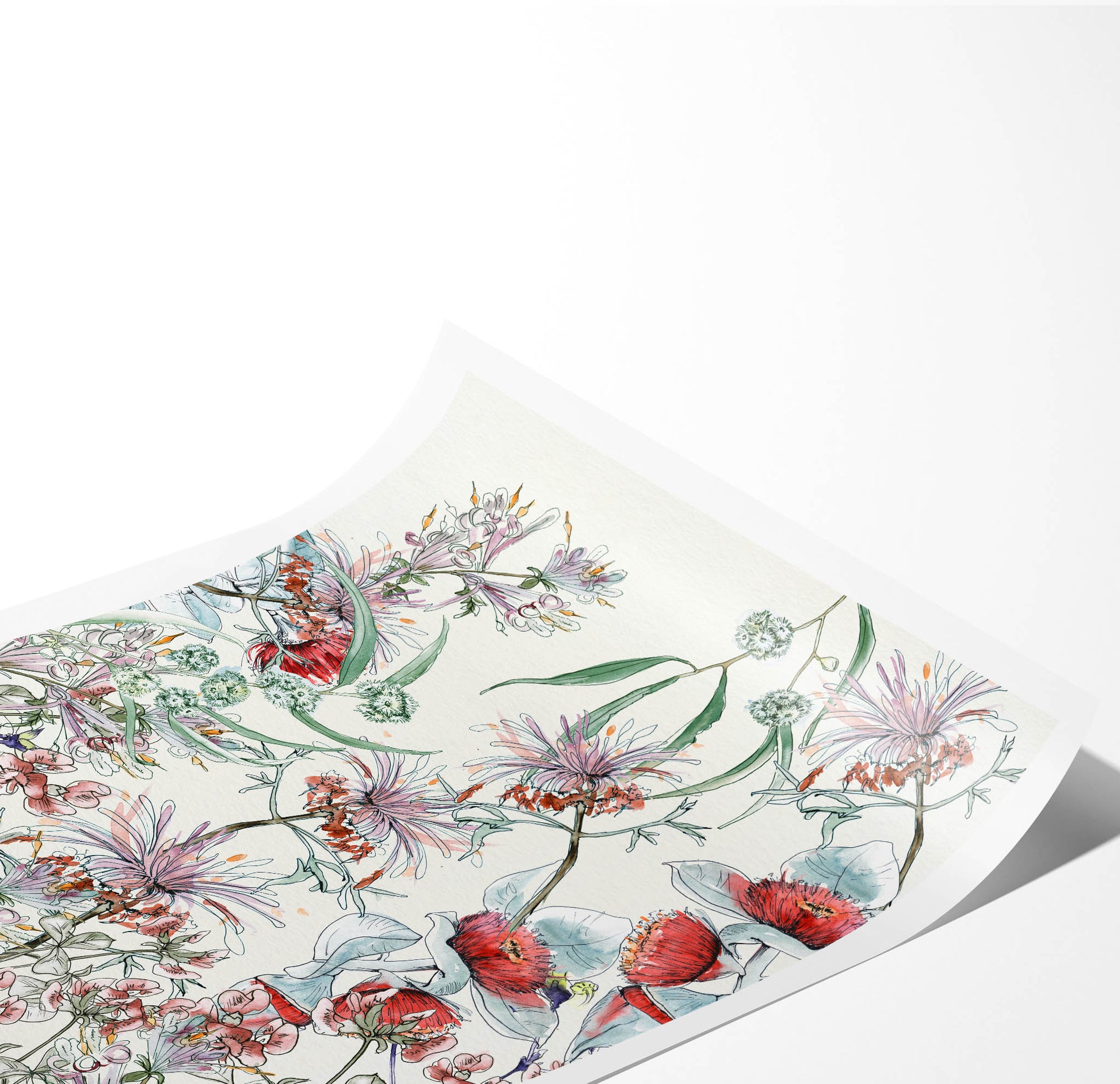 This pretty print features Australian native flowers in a watercolour and ink style in muted tones.
