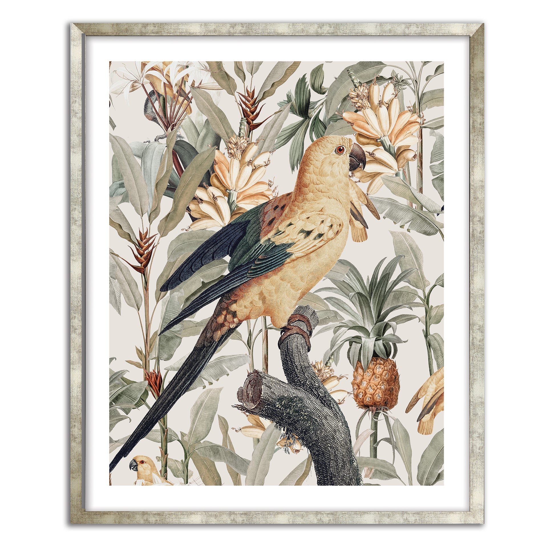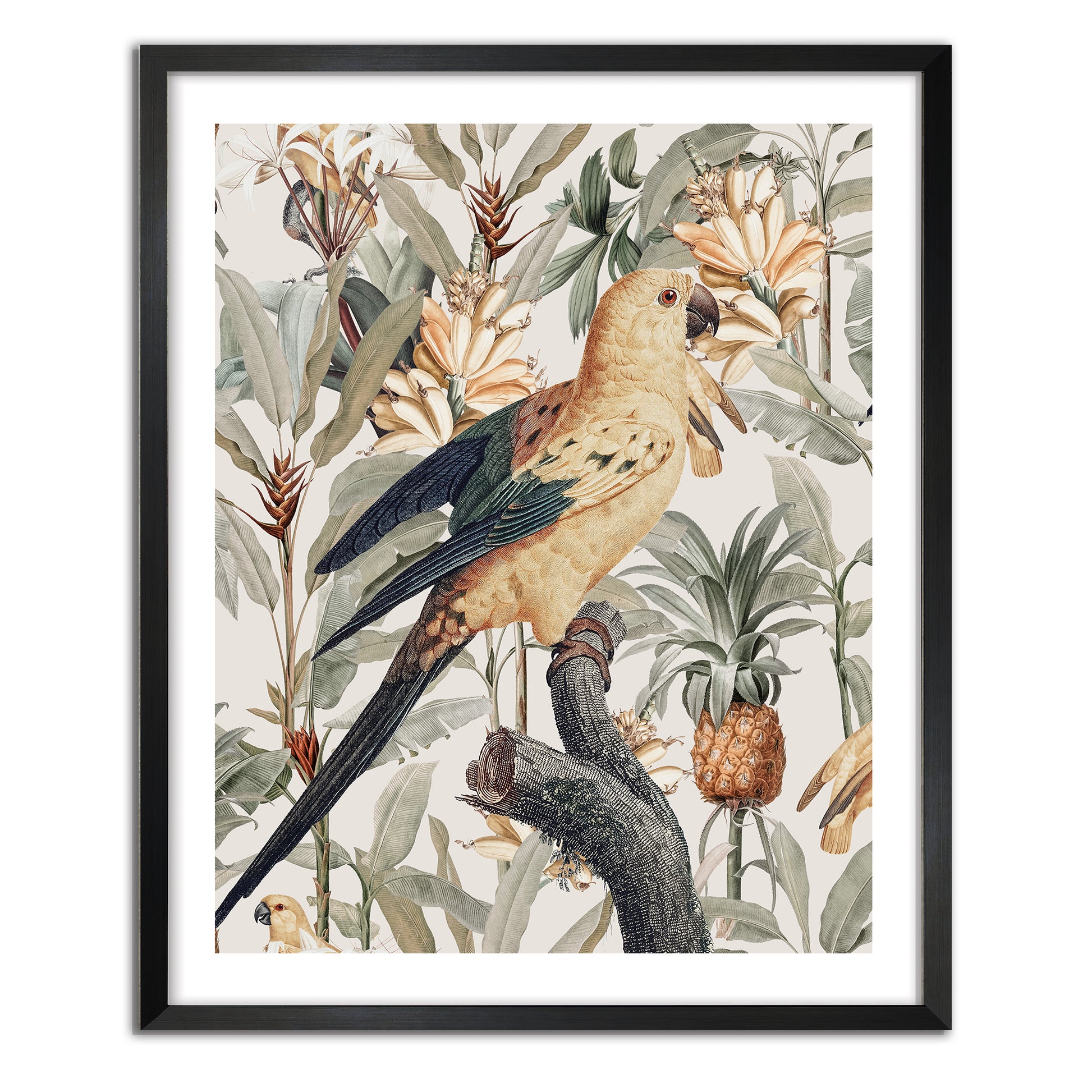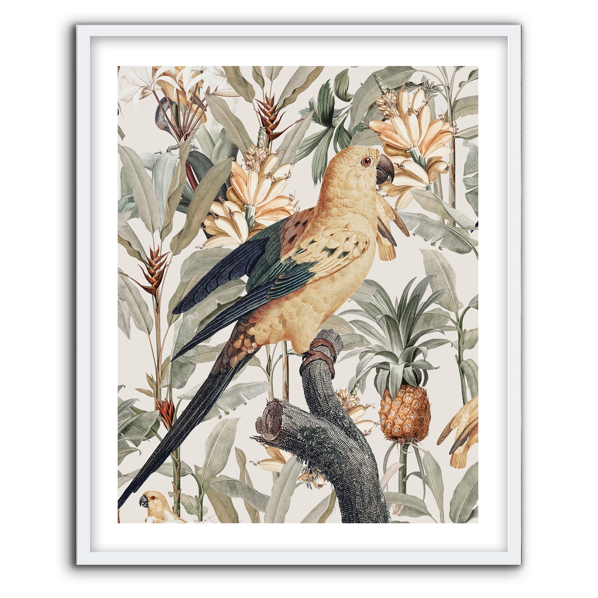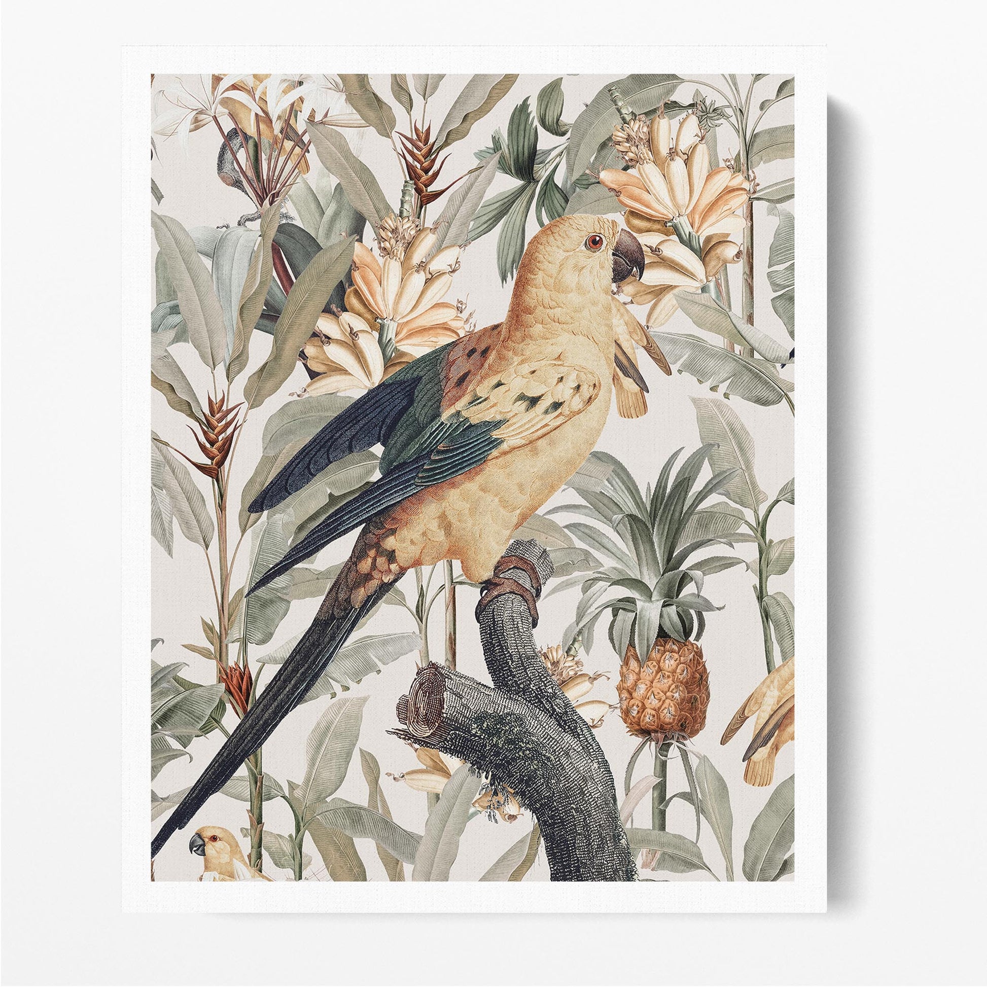 Chic modern contemporary tropicana. Perched birds in paradise with a lush tropical twist. Golden yellow blonde backgrounds of florals, tropical fruits and sweeping leafy foliage in sage green rest behind a graceful tropical bird bearing green tips with slight raised wings which represent happiness.