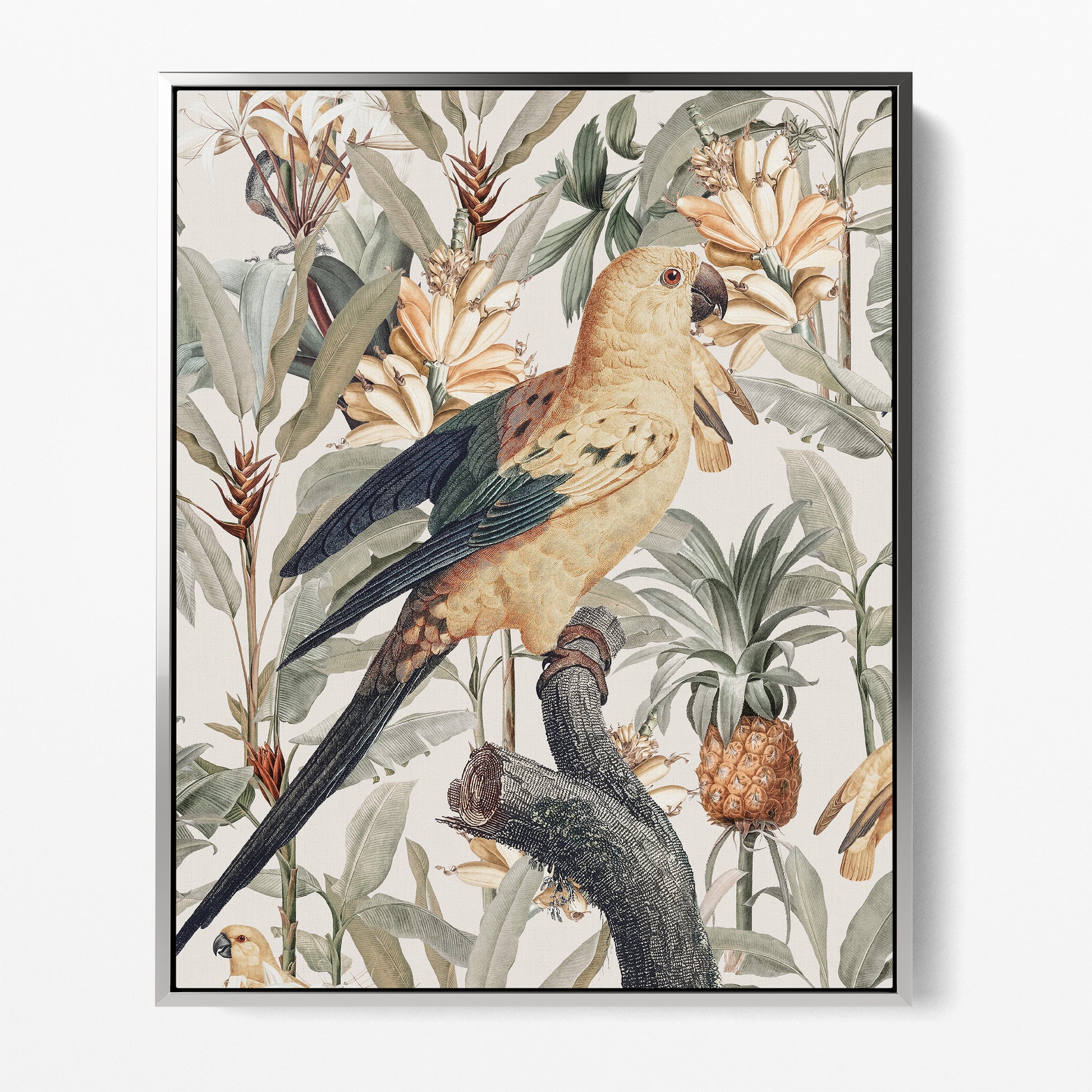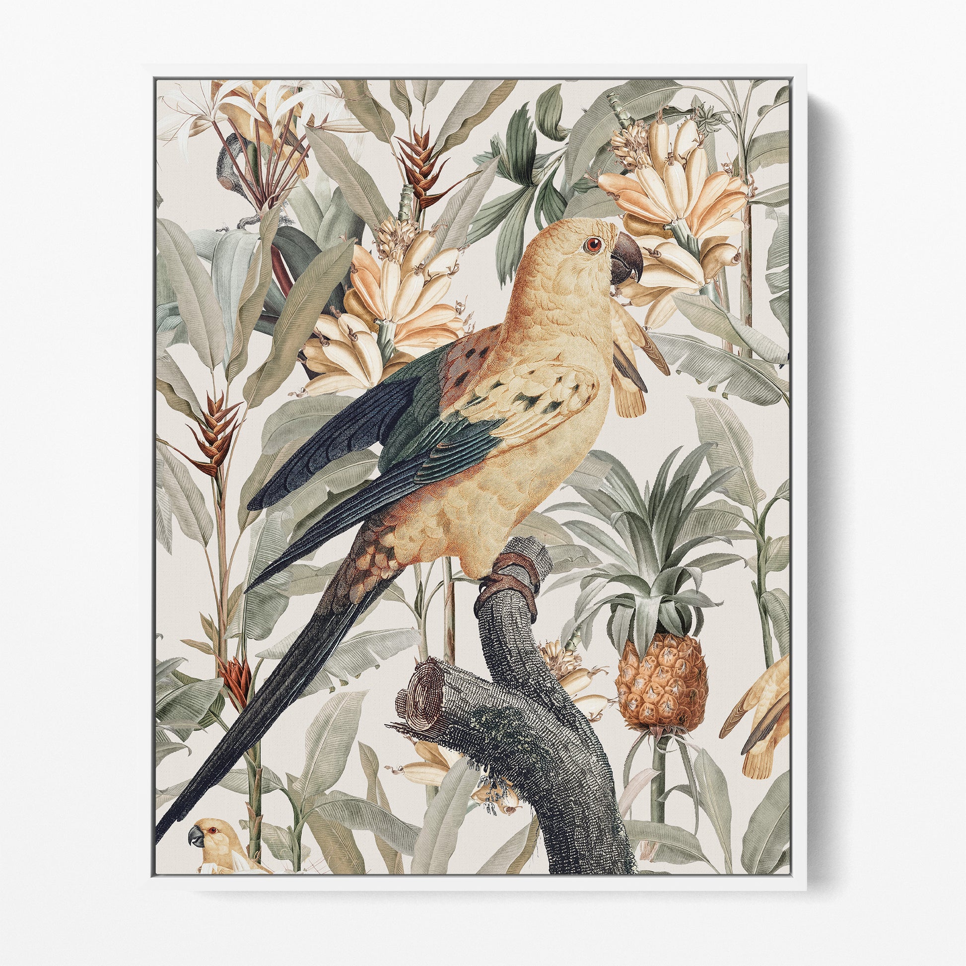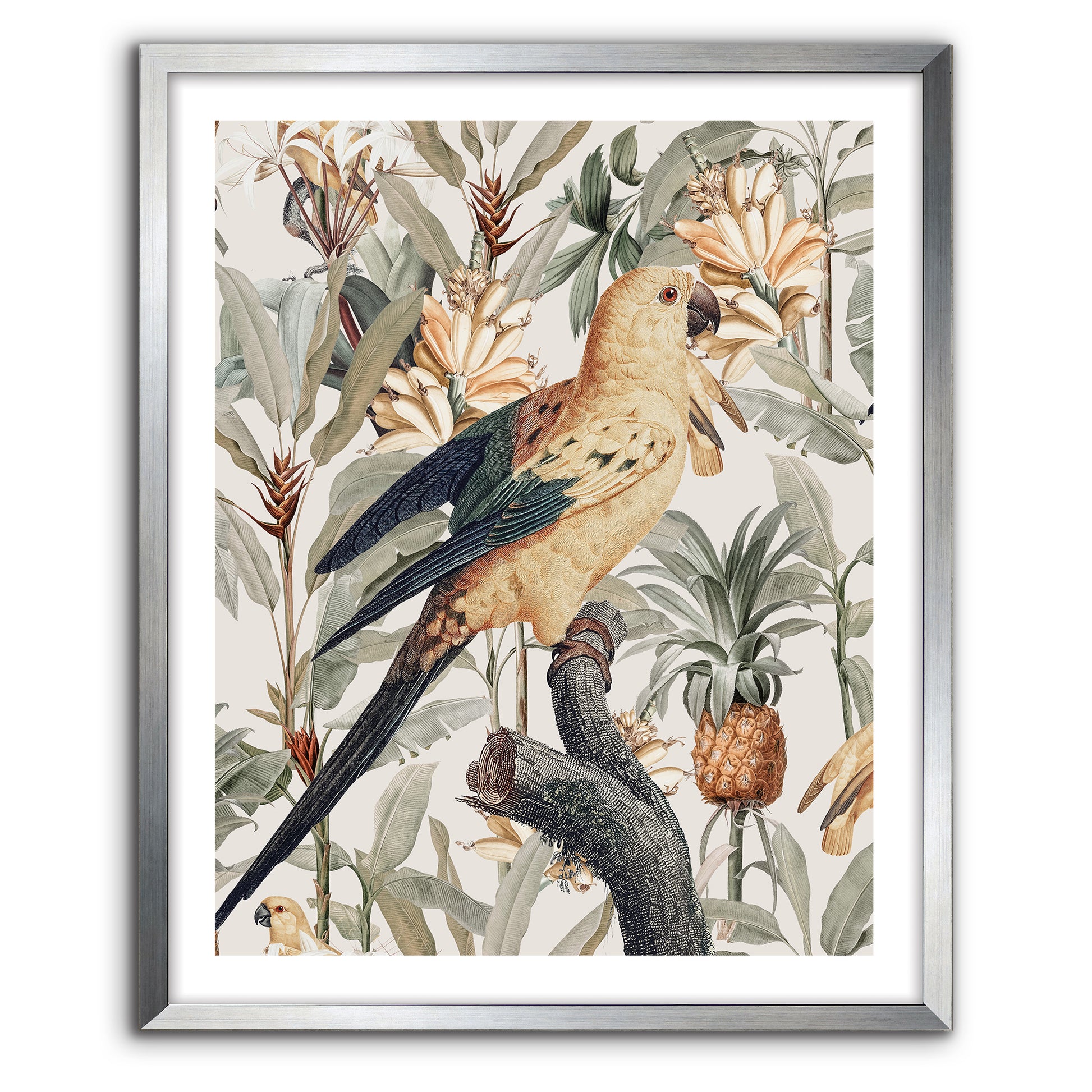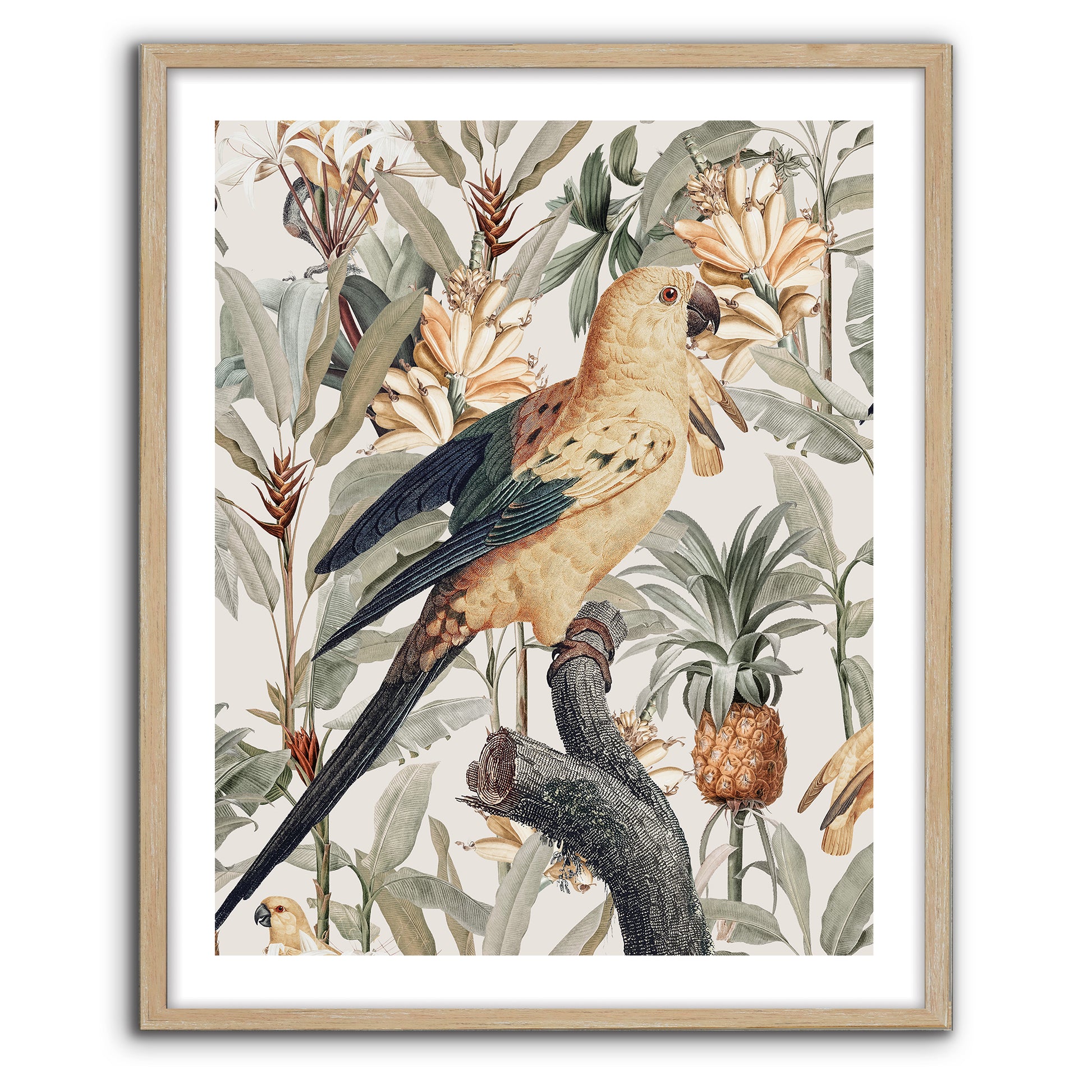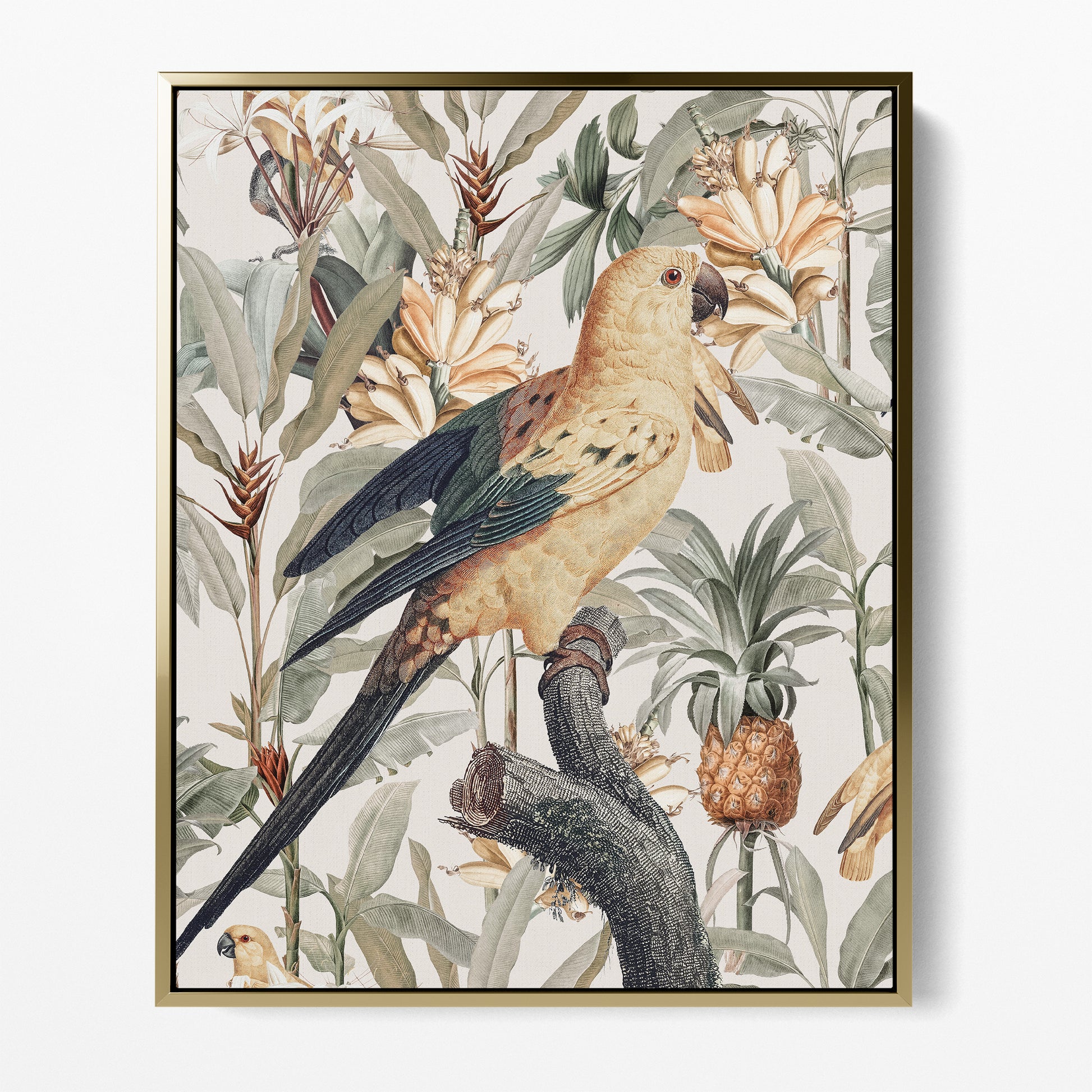Chic modern contemporary tropicana. Perched birds in paradise with a lush tropical twist. Golden yellow blonde backgrounds of florals, tropical fruits and sweeping leafy foliage in sage green rest behind a graceful tropical bird bearing green tips with slight raised wings which represent happiness.