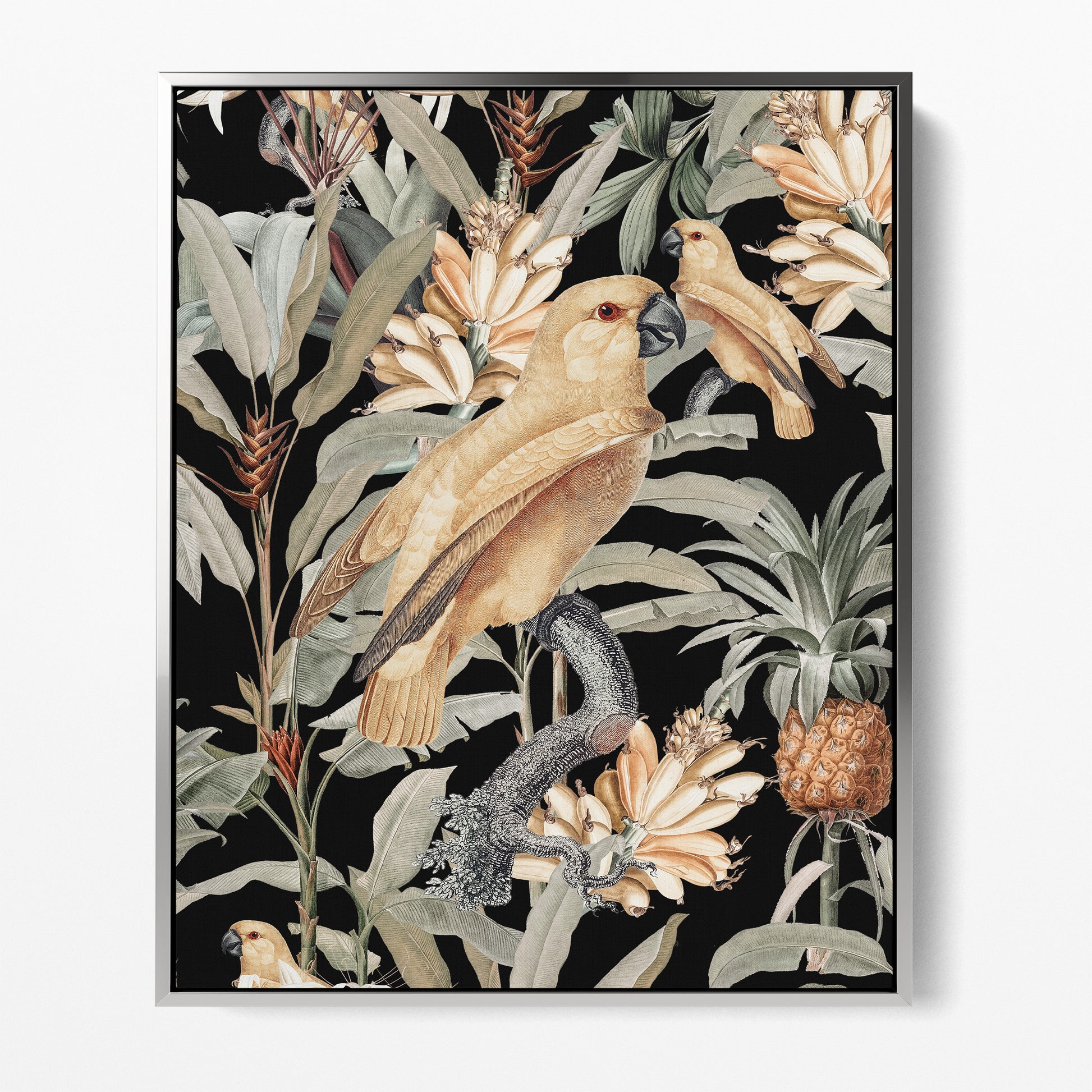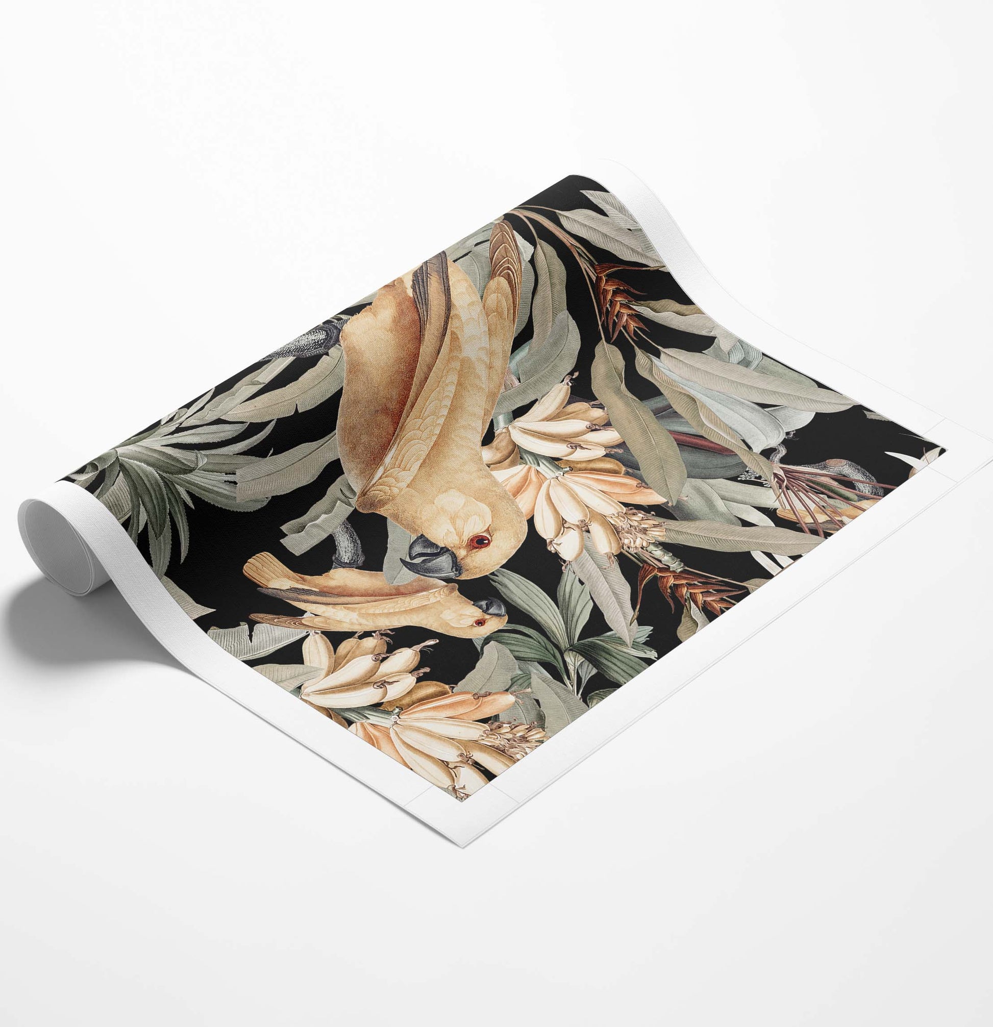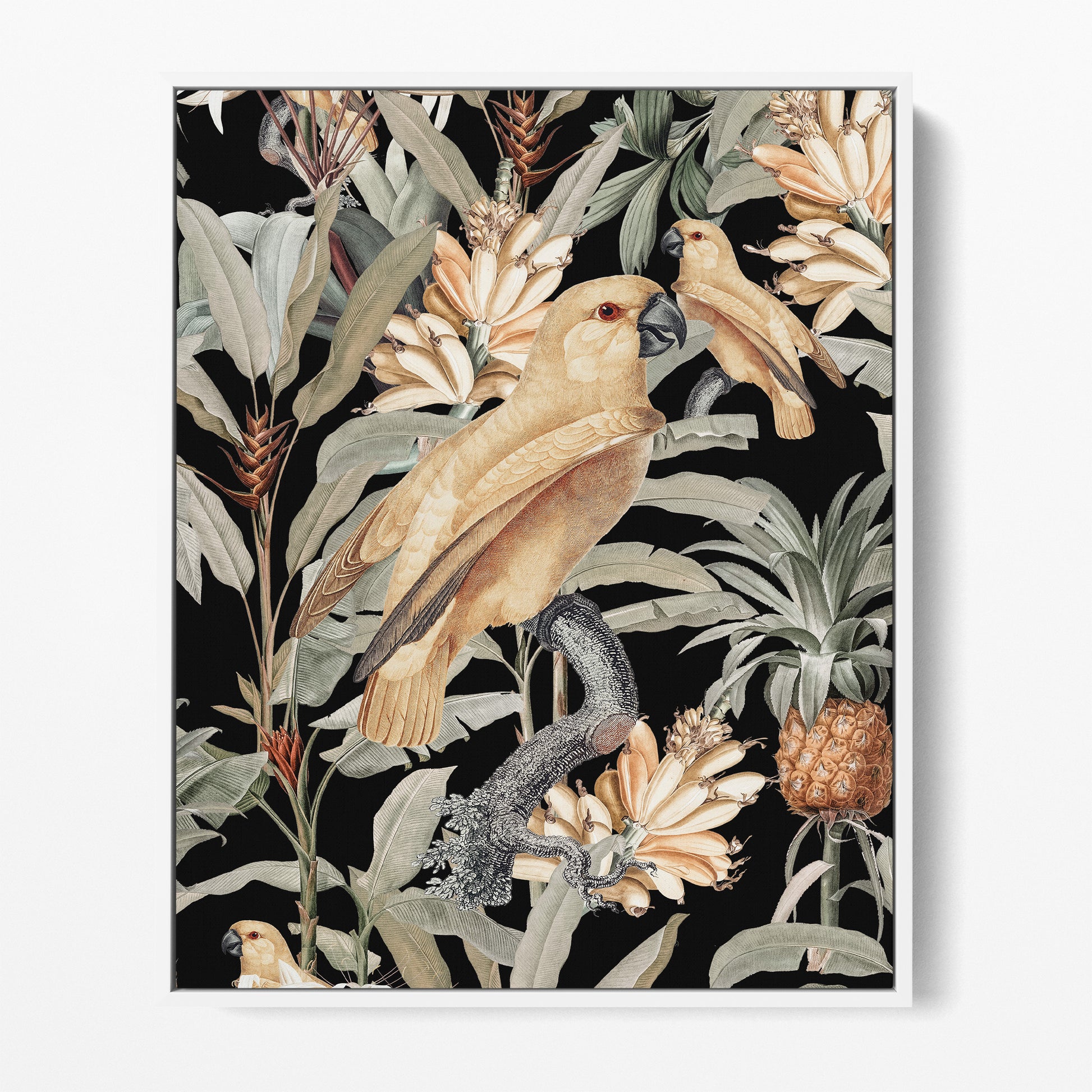 Dark contrasting backgrounds with florals, tropical yellow fruits and sweeping leafy foliage in sage green rest behind a graceful tropical blonde bird with slight raised wings representing happiness.