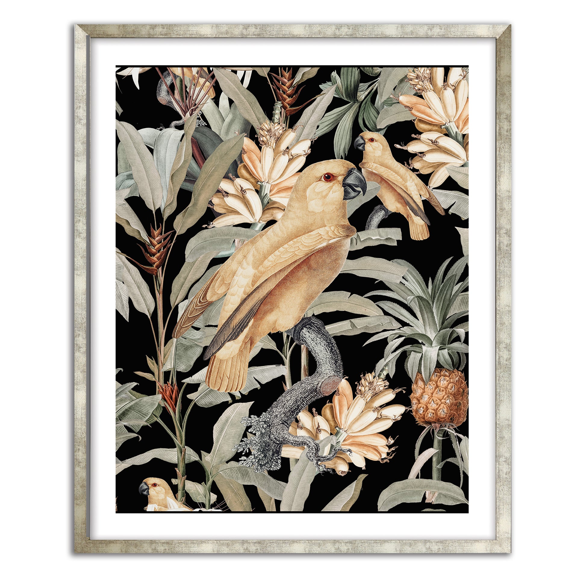 Chic modern contemporary tropicana art print. Perched birds in paradise with a heady tropical twist.