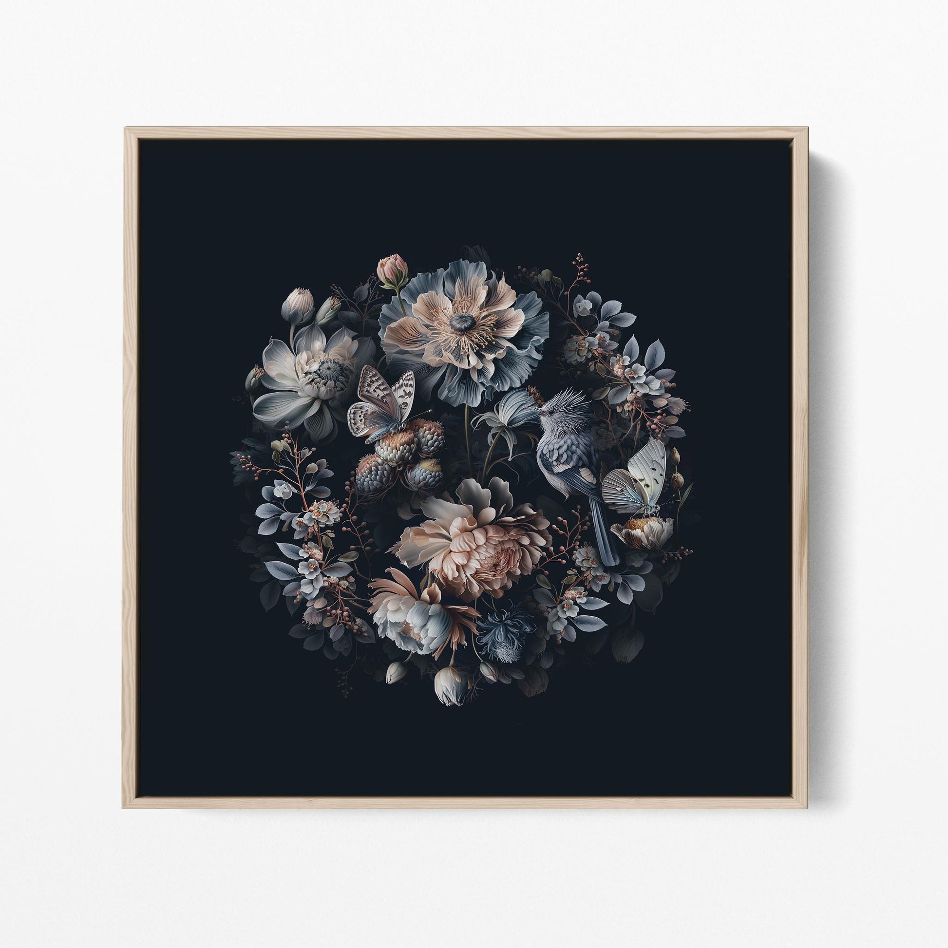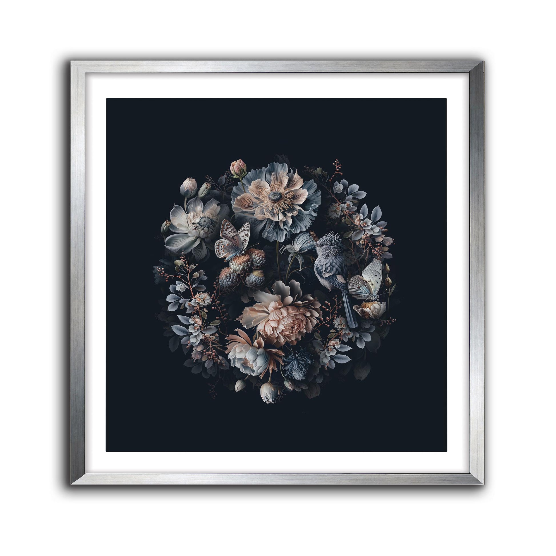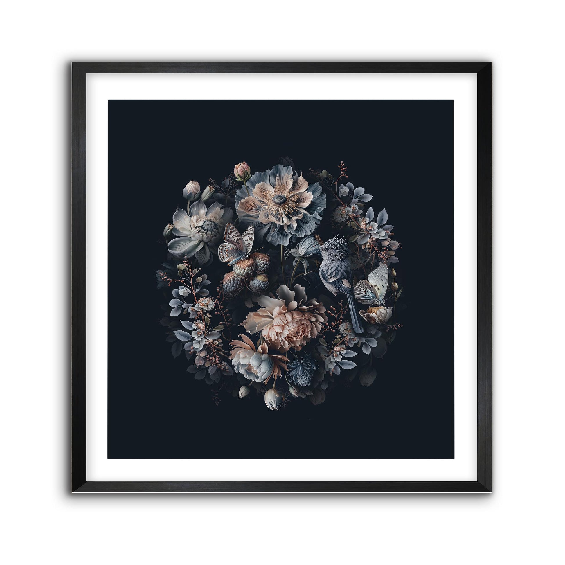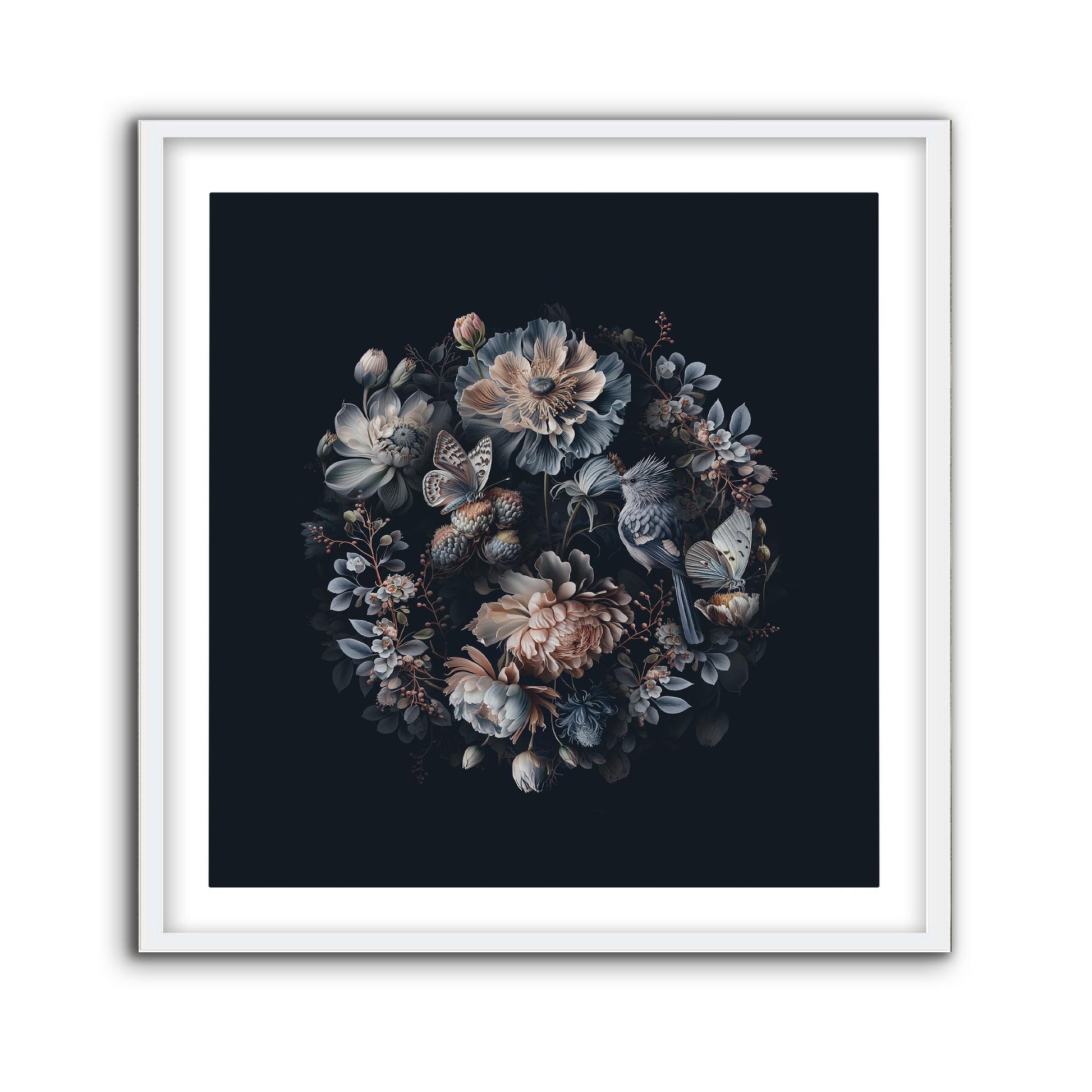 A nightgarden of muted foliage, birds and insects. This arrangement is featured against a textured dark background suggesting the appearance of night.