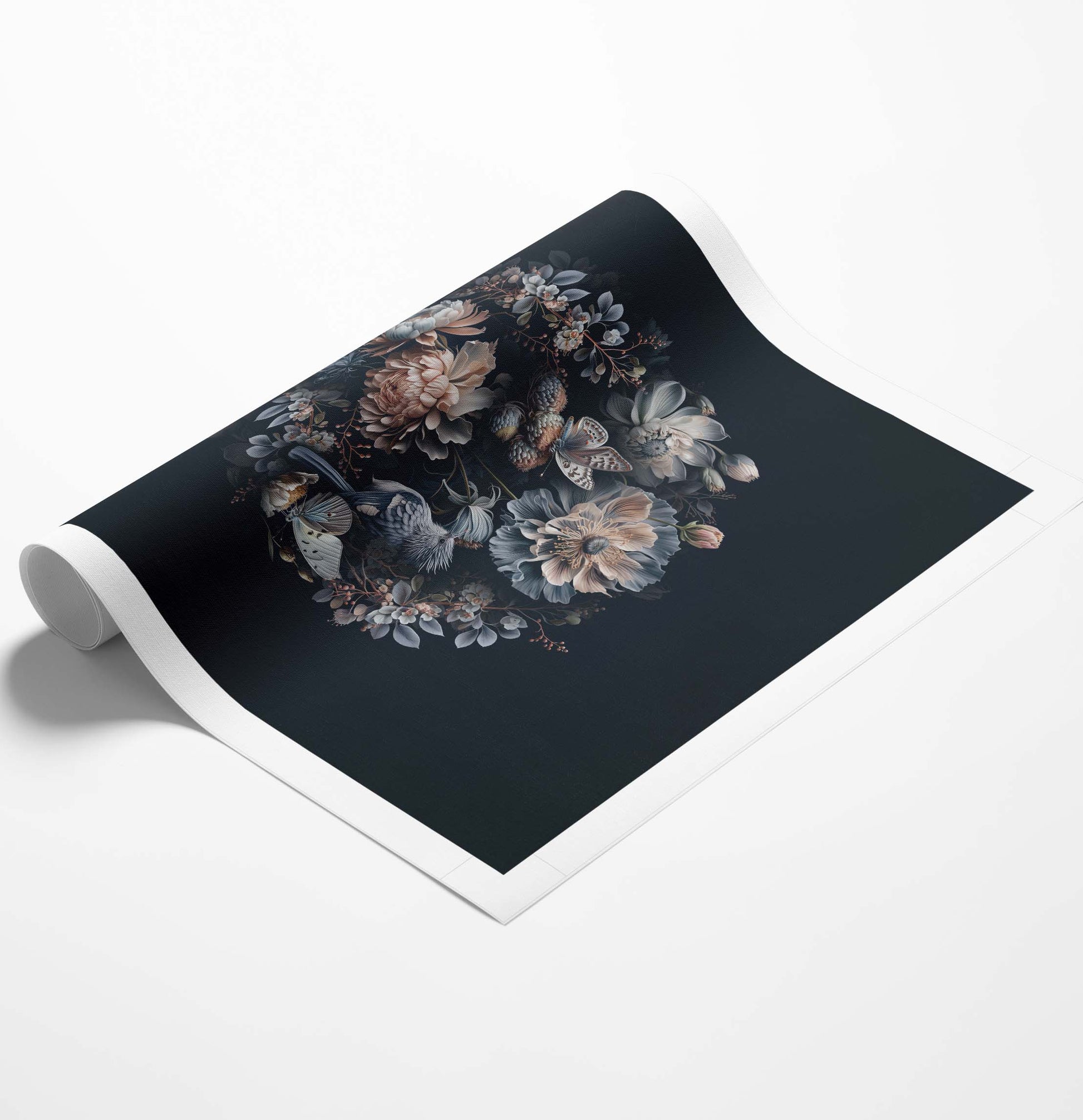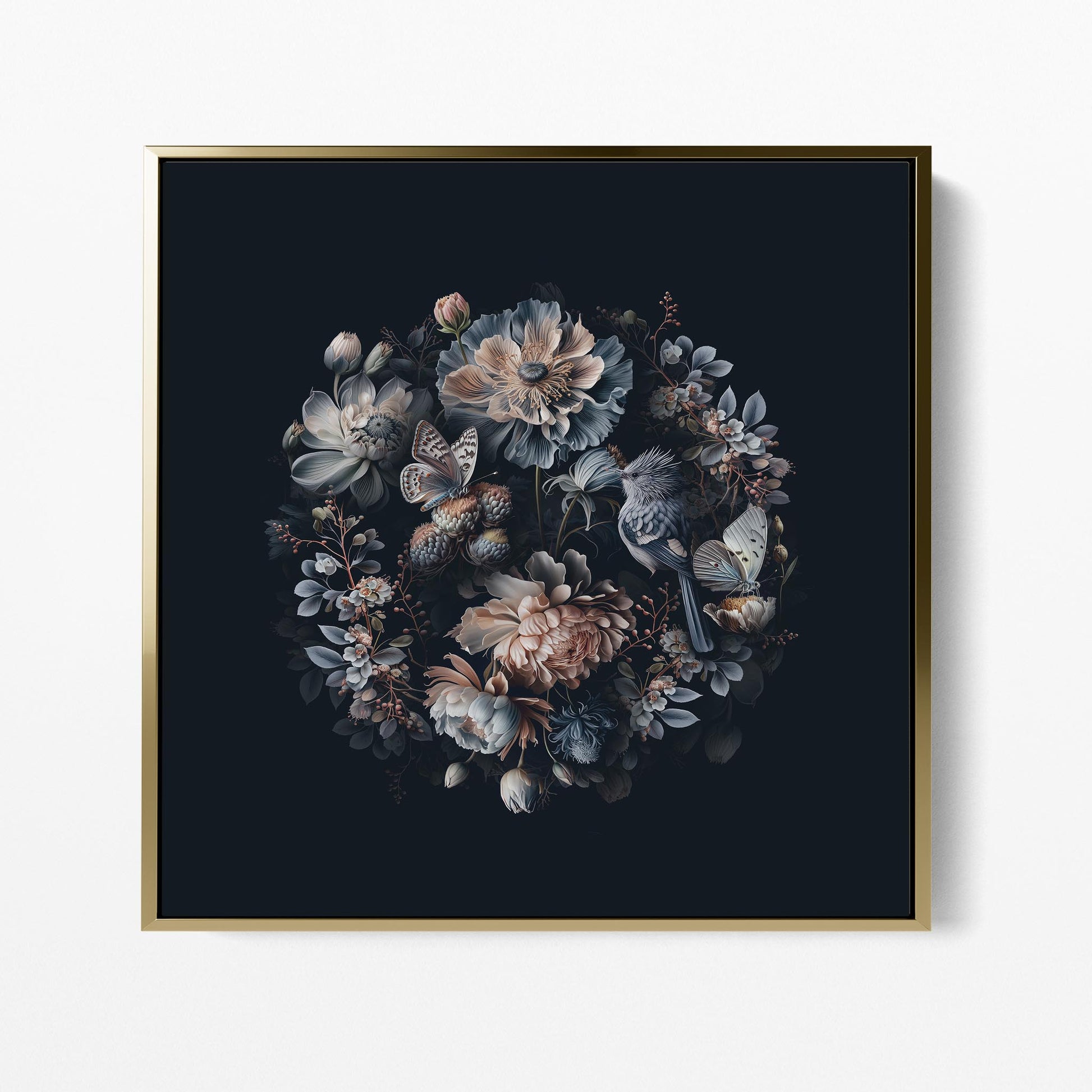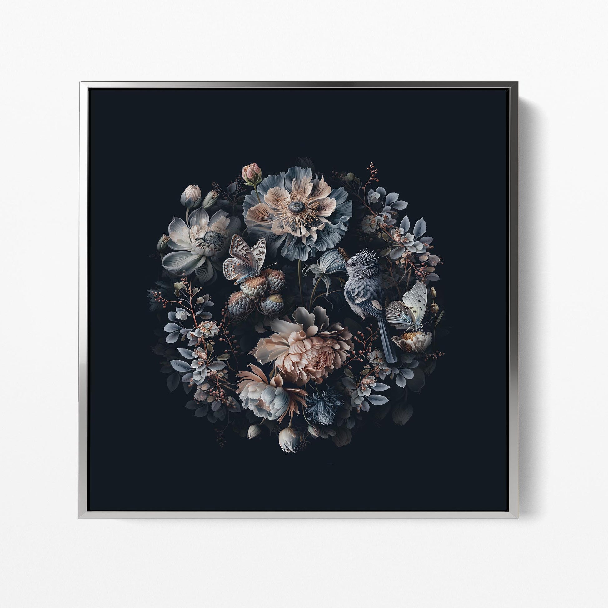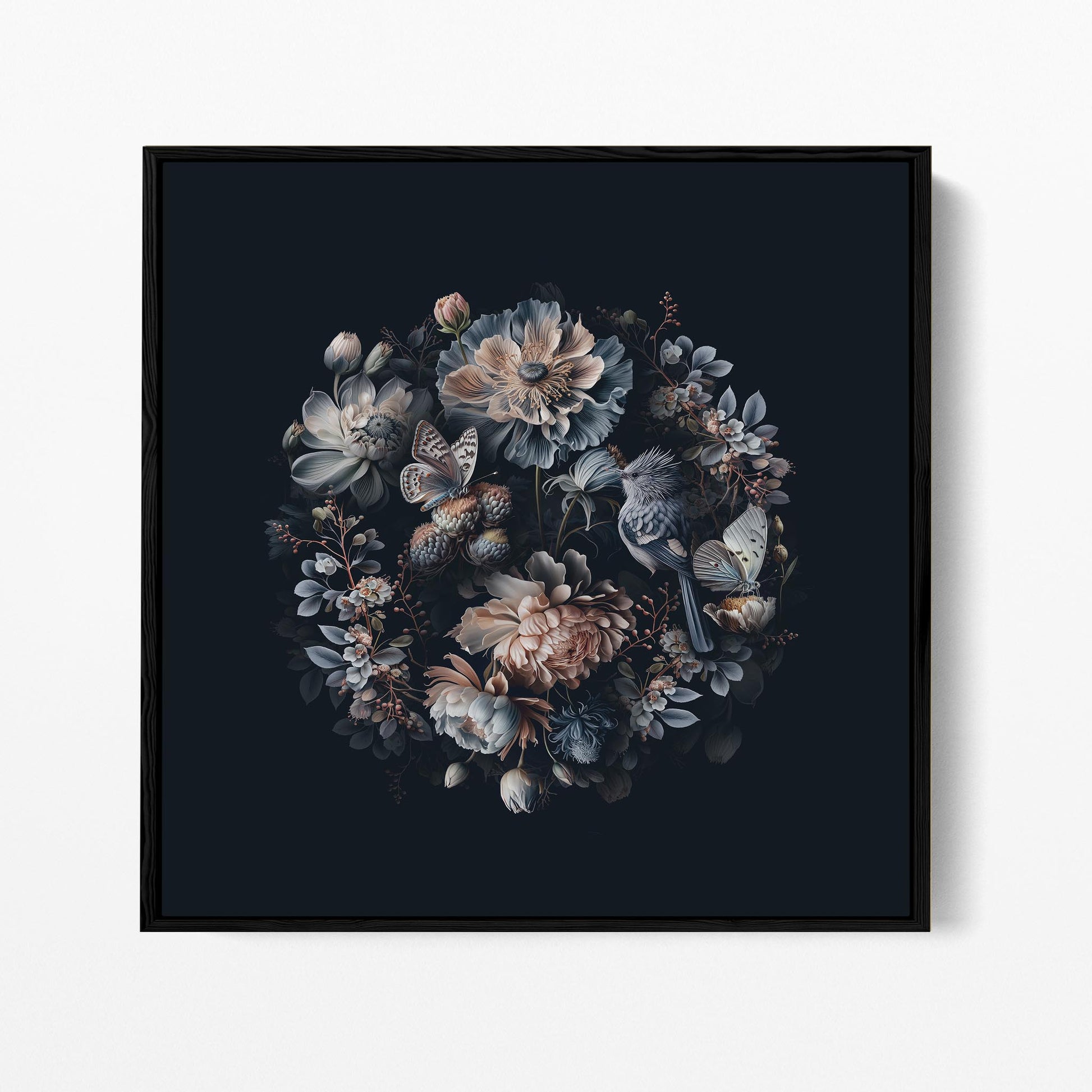 A nightgarden of muted foliage, birds and insects. This arrangement is featured against a textured dark background suggesting the appearance of night.