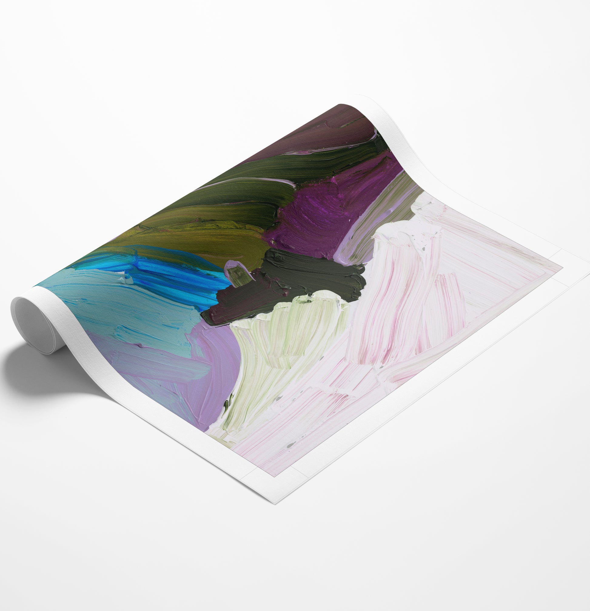 Large sweeping brush stokes which form a beautiful abstract landscape. Displayed against a midnight background to give vibrancy and life to each individual brushstroke, This creates a space of intuitive calm, warmth and happiness.