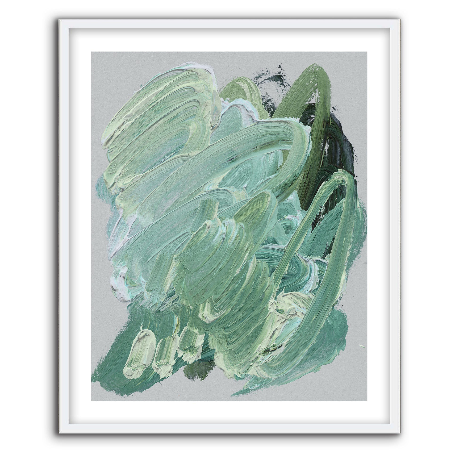 Large sweeping brushstrokes forming a beautiful abstract collection of green hues. This Artprint is displayed against a pale background to give an impression of peace and tranquility.