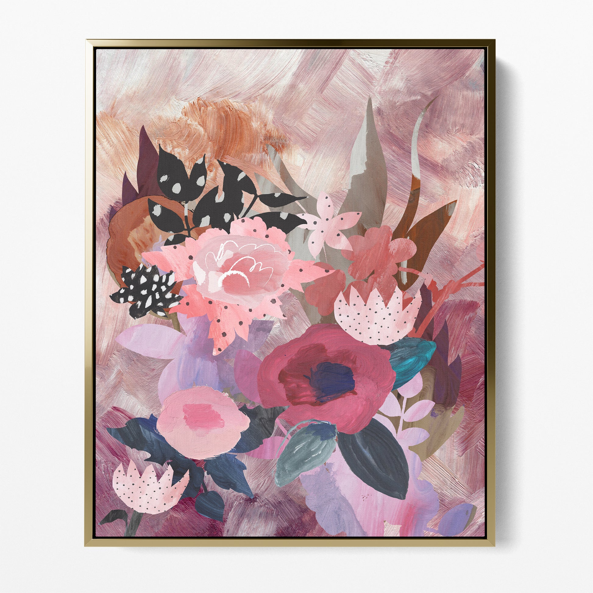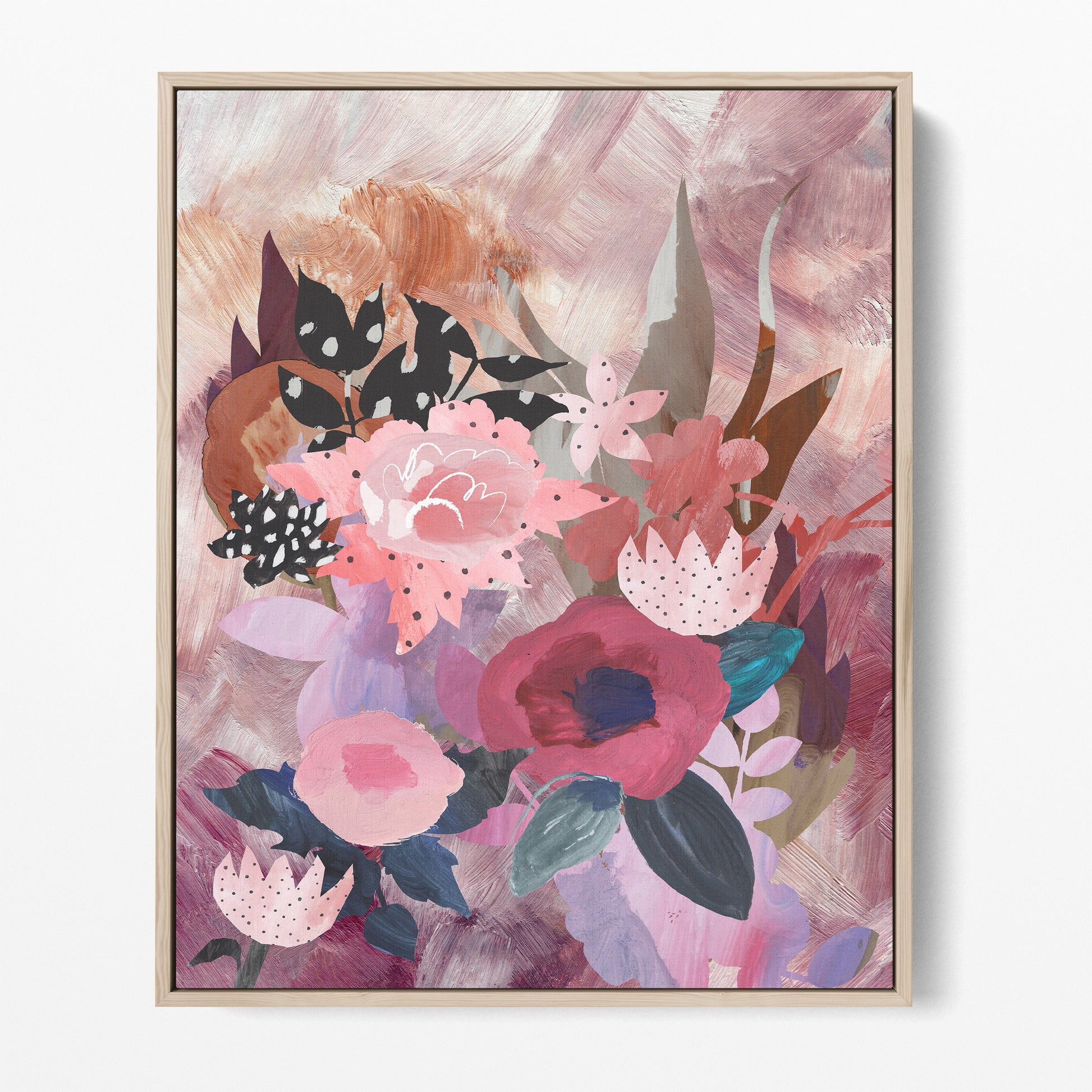A pink hued flower garden filled with sweetly collaged flowers on a bed of pinks, lilacs, reds and blush tones