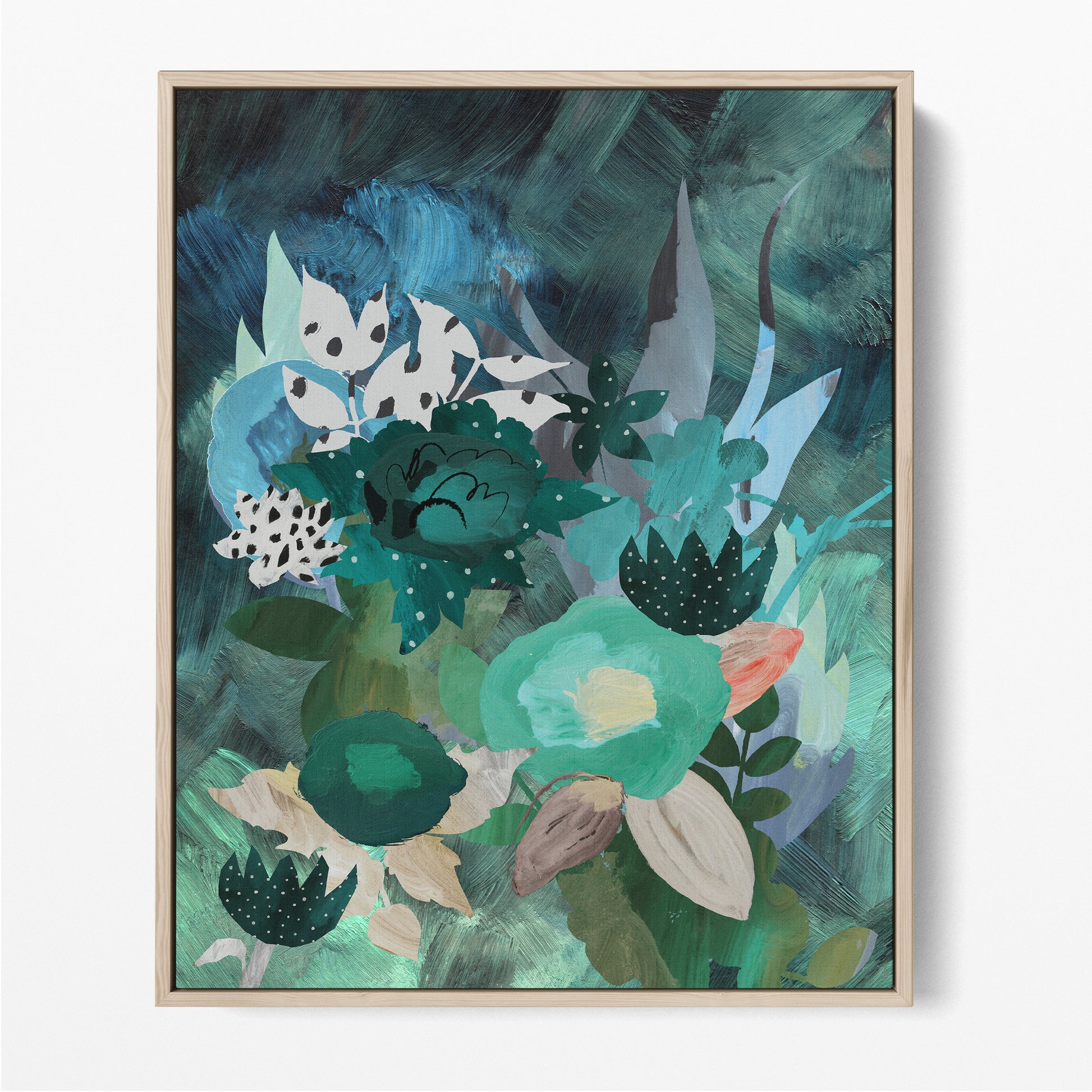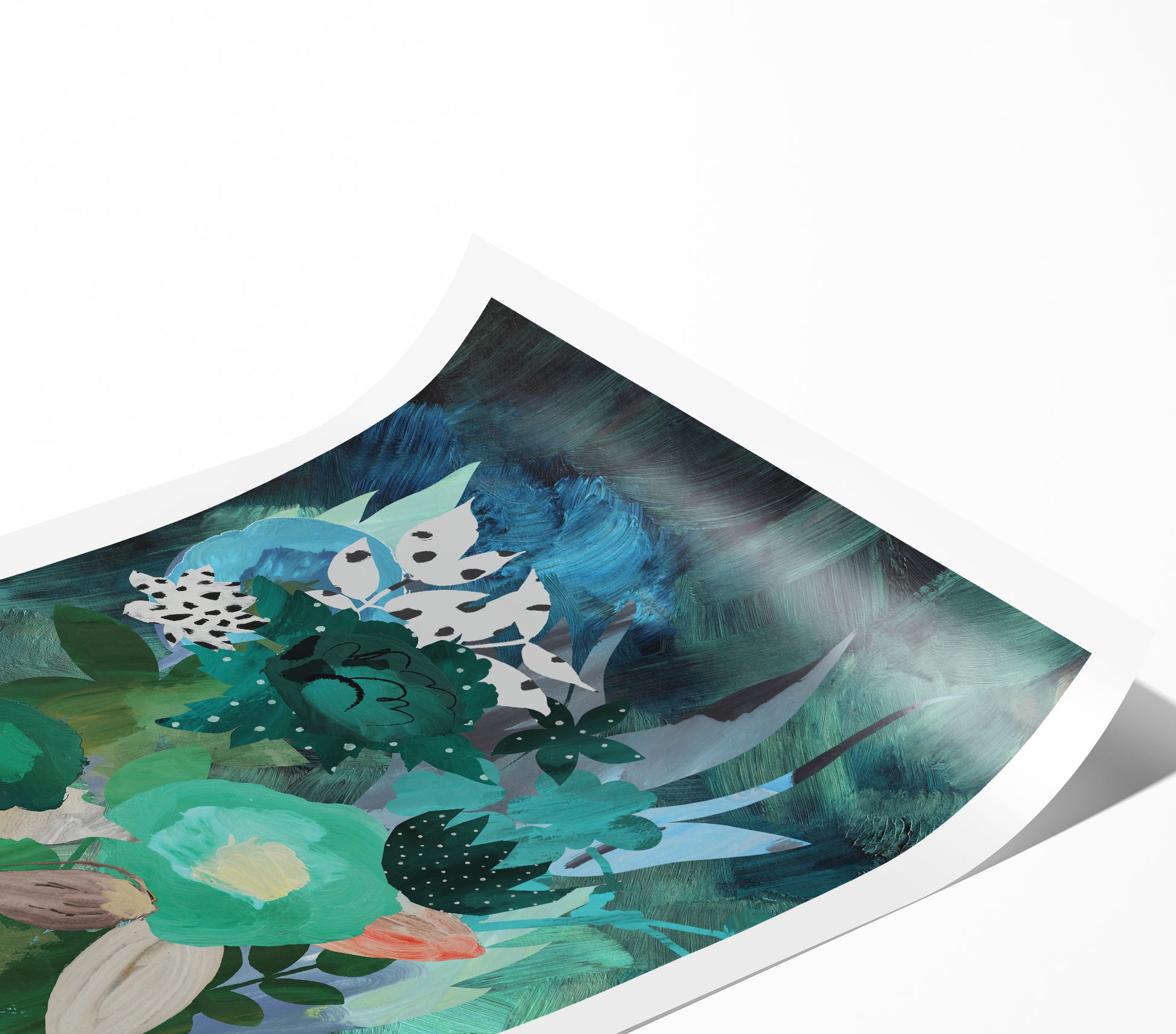 A green garden of dark and light collaged flowers on a bed of green and blue brushstrokes.