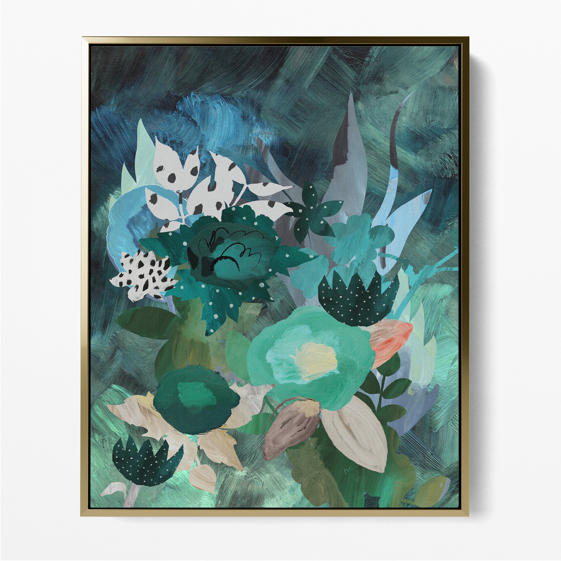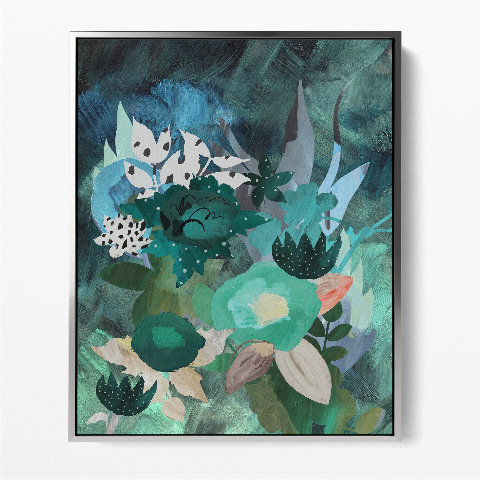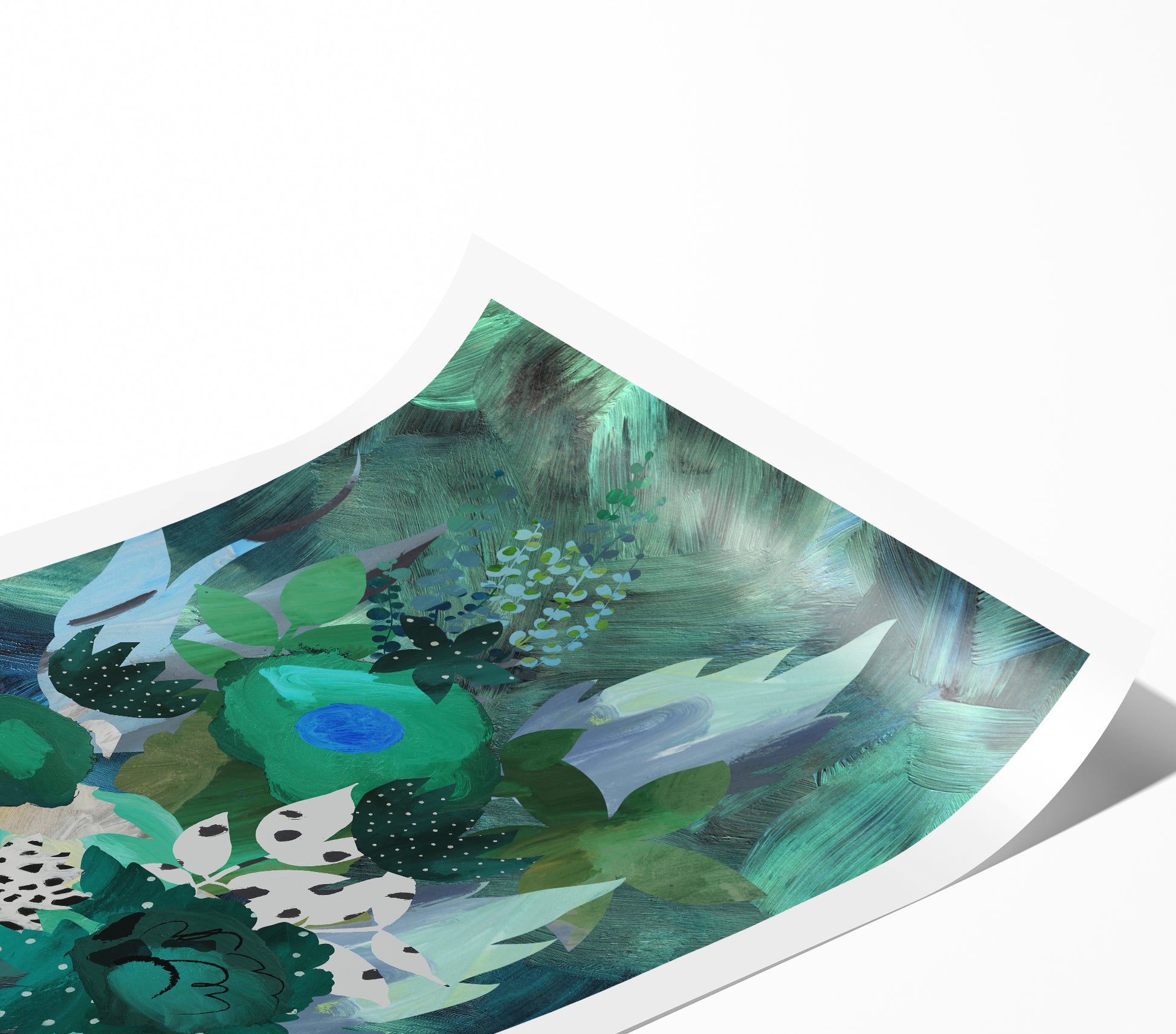 A green garden of dark and light collaged flowers on a bed of green and blue brushstrokes.