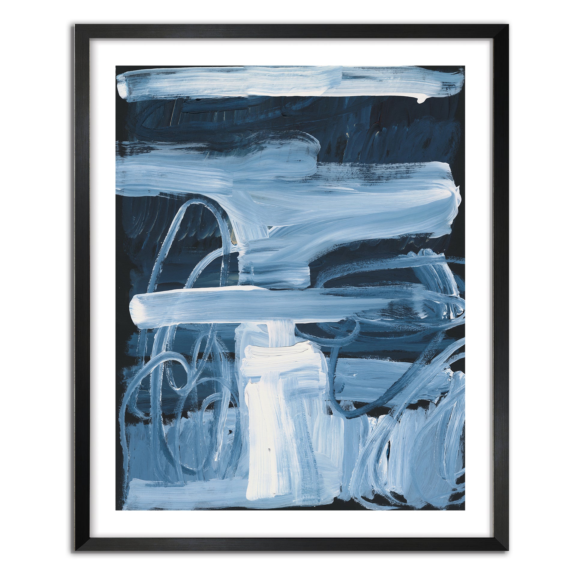 Large sweeping brush stokes which form a beautiful abstract landscape. Displayed against a midnight background to give vibrancy and life to each individual brushstroke, This creates a space of intuitive calm and happiness.