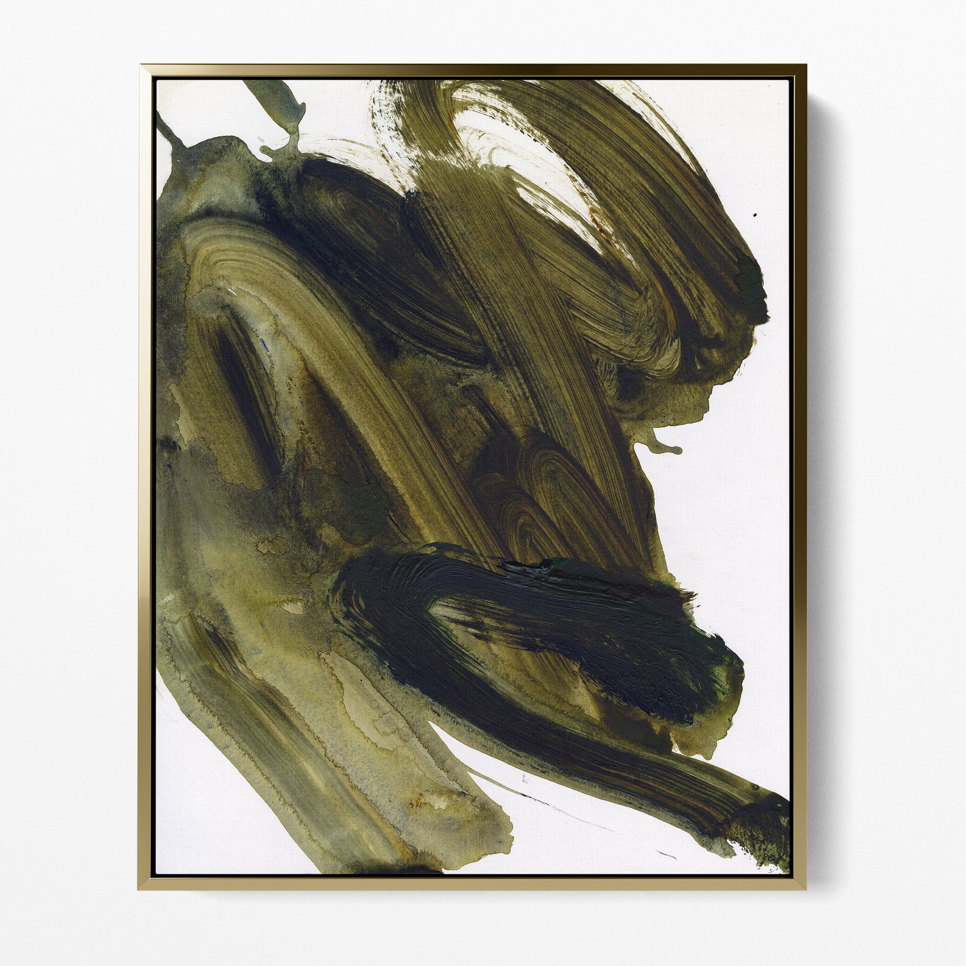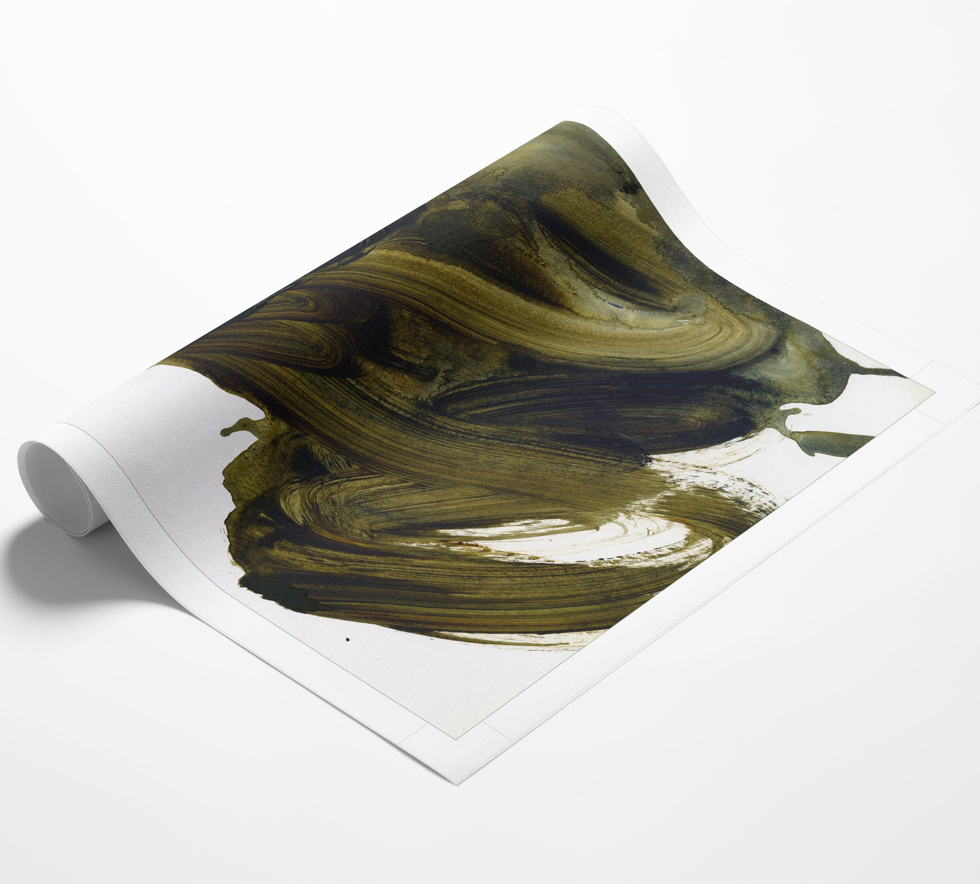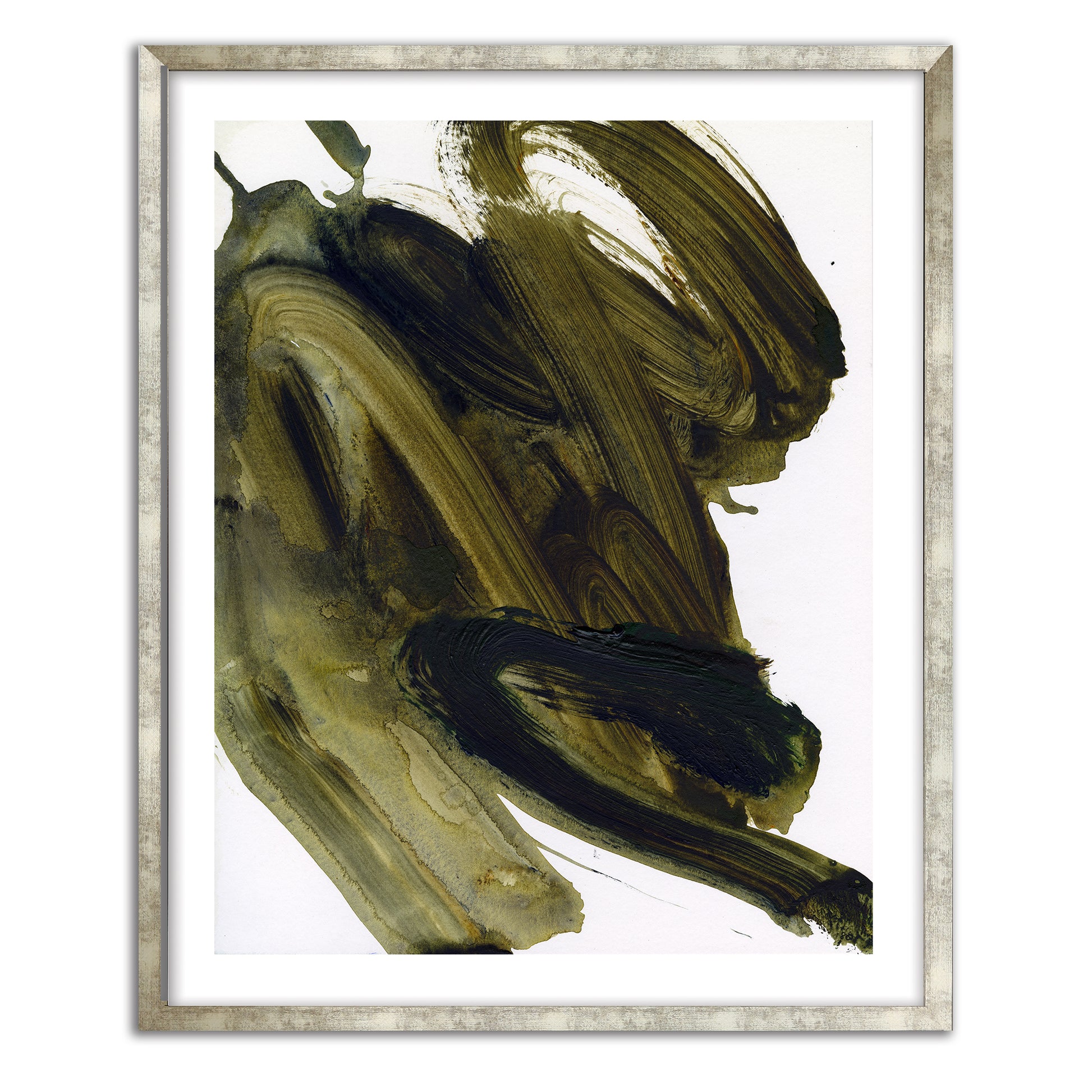 Large sweeping brush strokes forming a beautiful abstract collection of olive green hues. This Artprint is displayed against a white background to give vibrancy and life to each individual brushstroke.