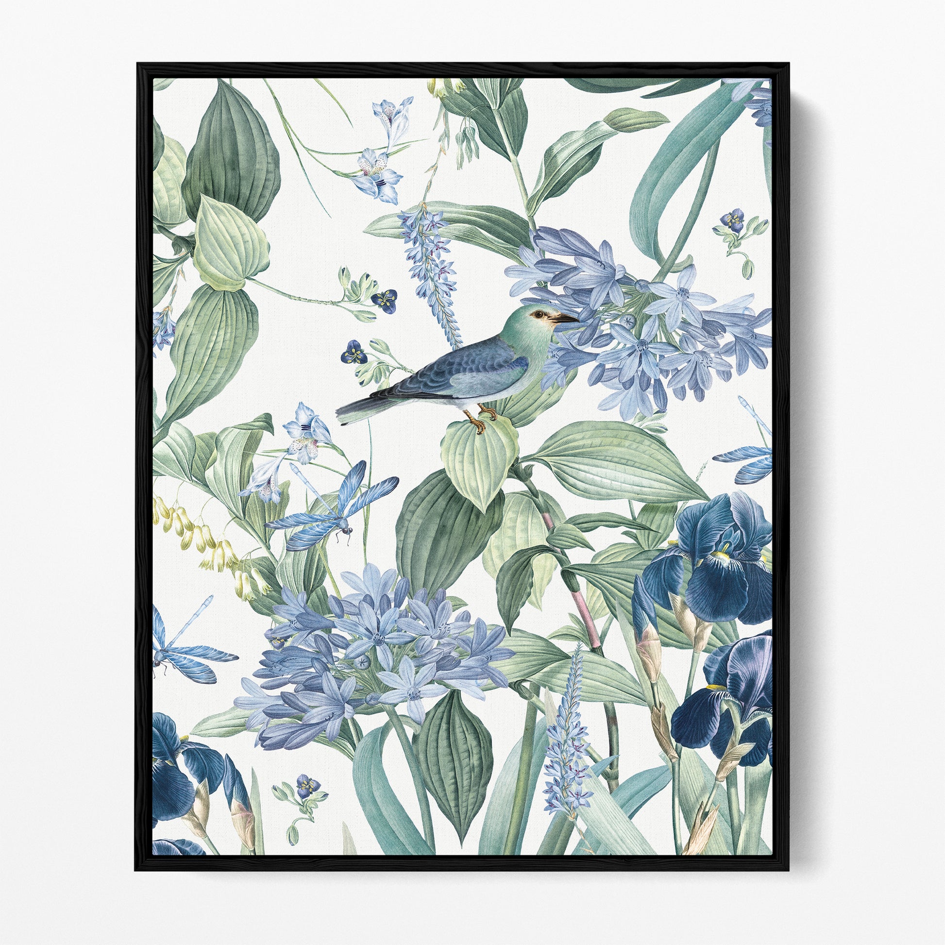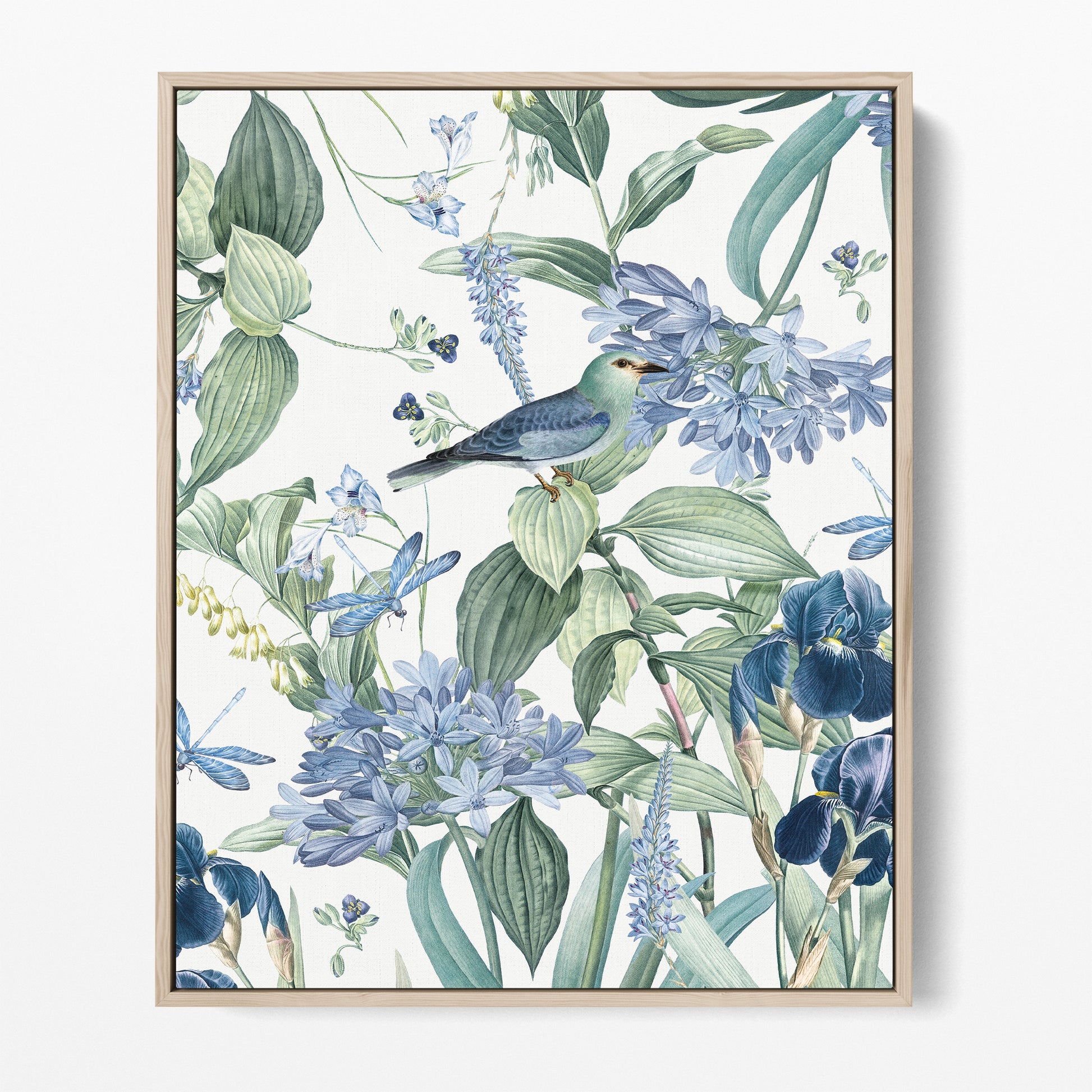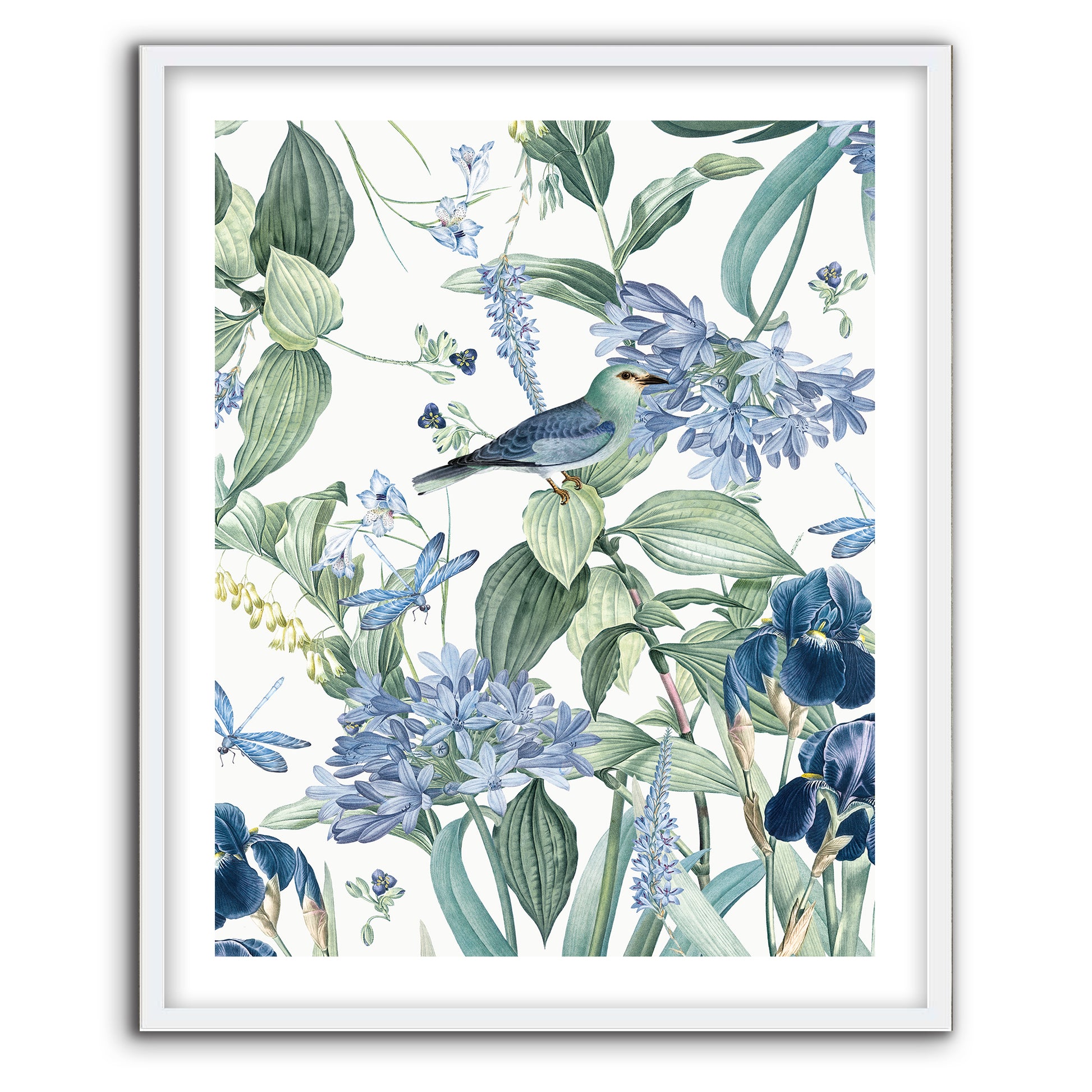 Bursting of blue and green florals, flying fauna and leafy green foliage. Fresh and contemporary flora and fauna has never looked so chic. Perched blue and green birds in paradise amoung beautiful floral arrangements.