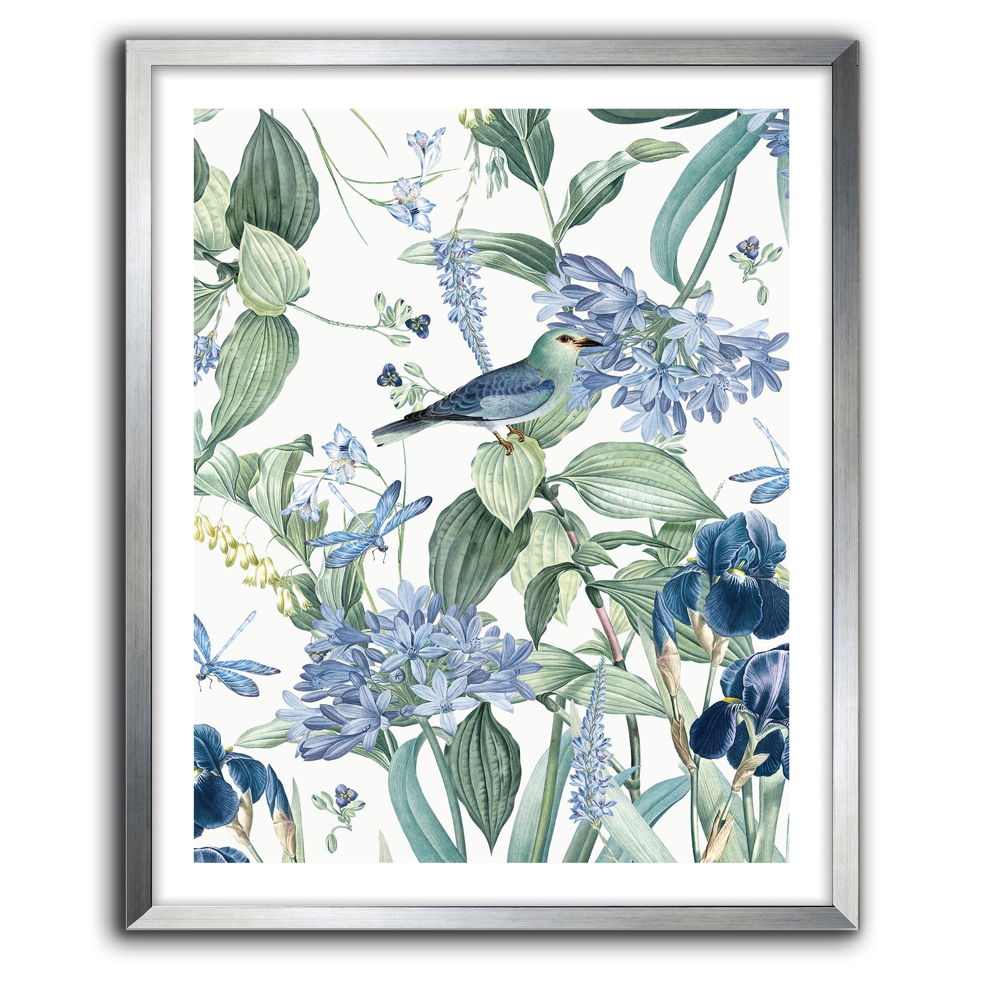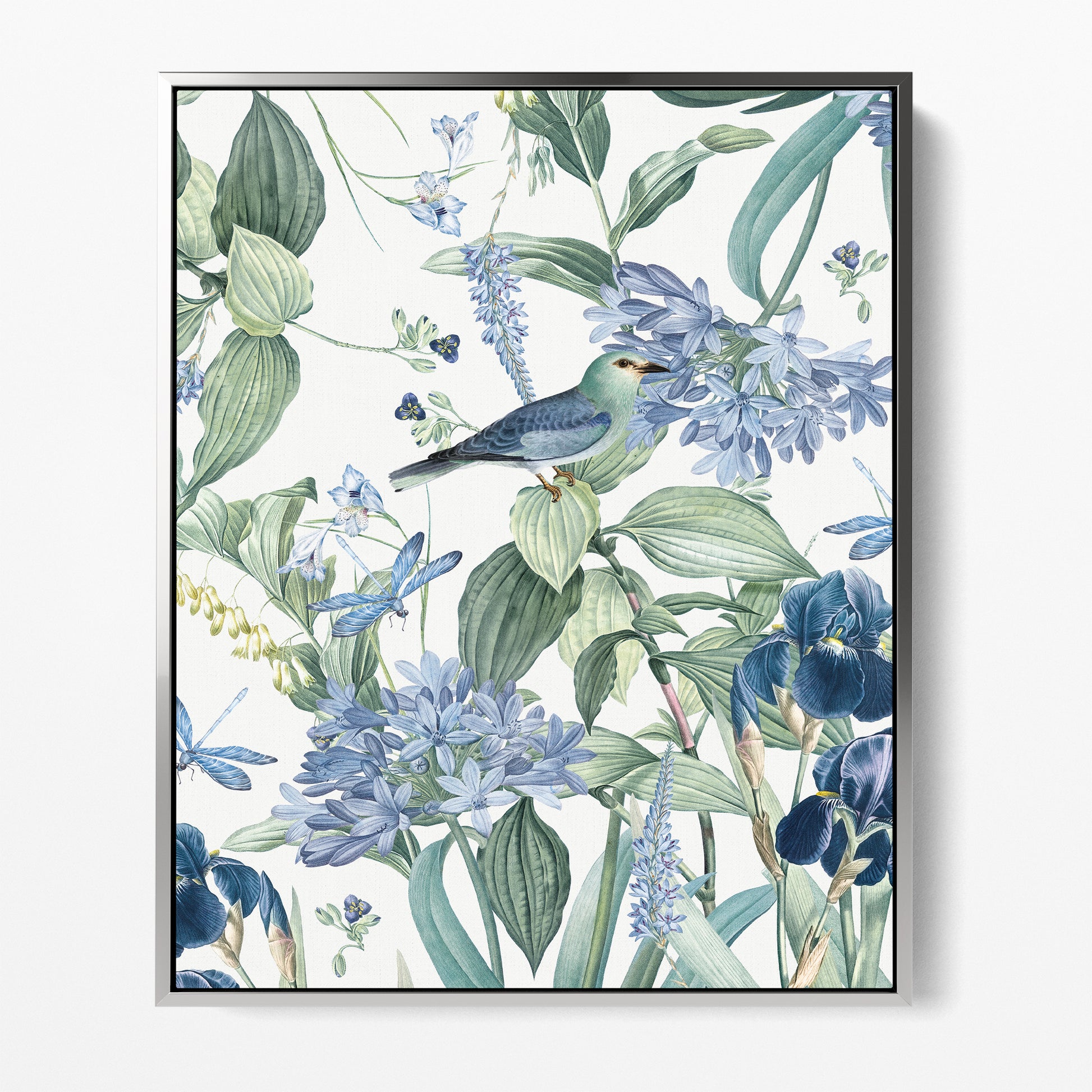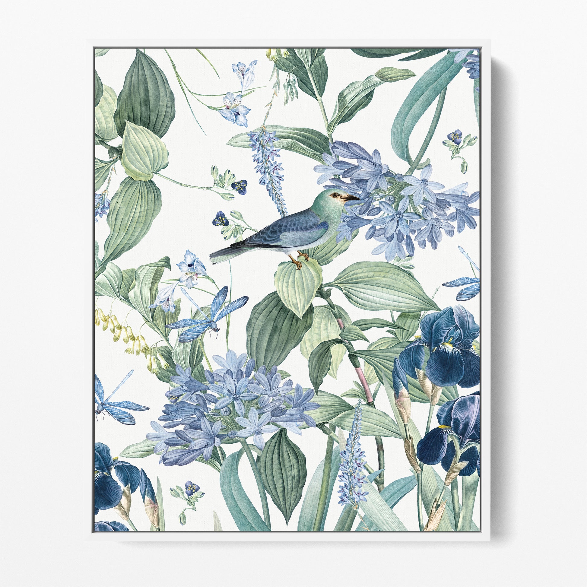 Bursting of blue and green florals, flying fauna and leafy green foliage. Fresh and contemporary flora and fauna has never looked so chic. Perched blue and green birds in paradise amoung beautiful floral arrangements.
