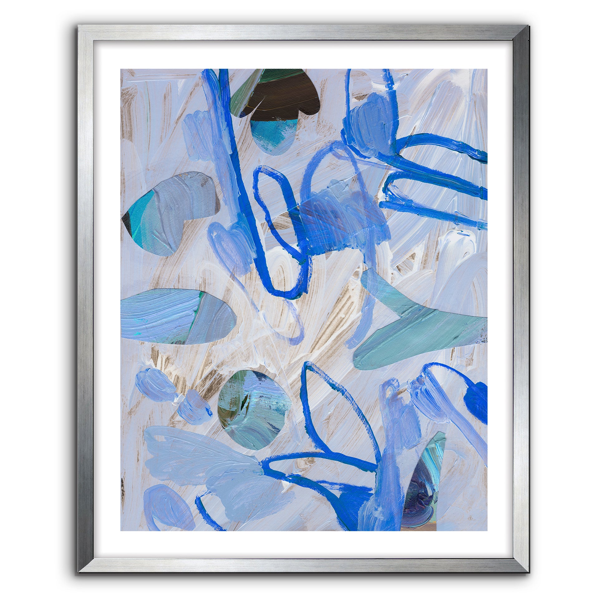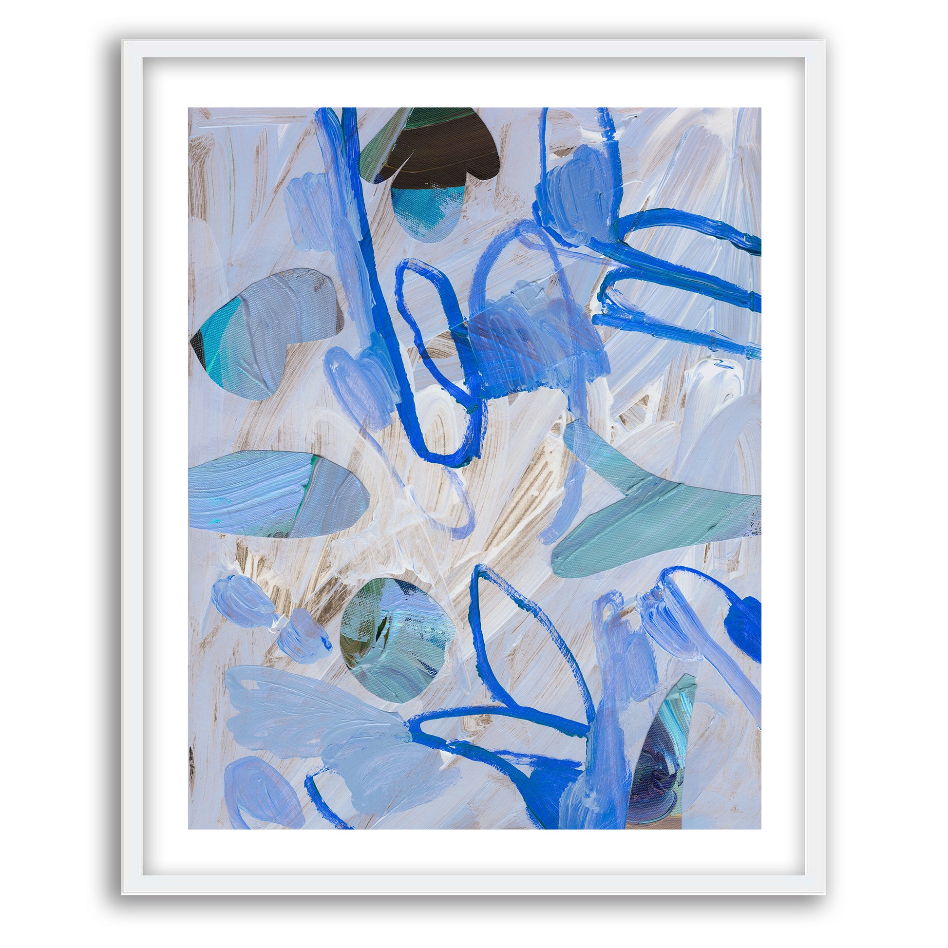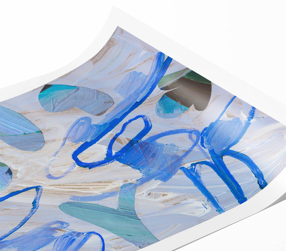 Blue tones in a cut-out collage Art Print set with a soft neutral blue background.