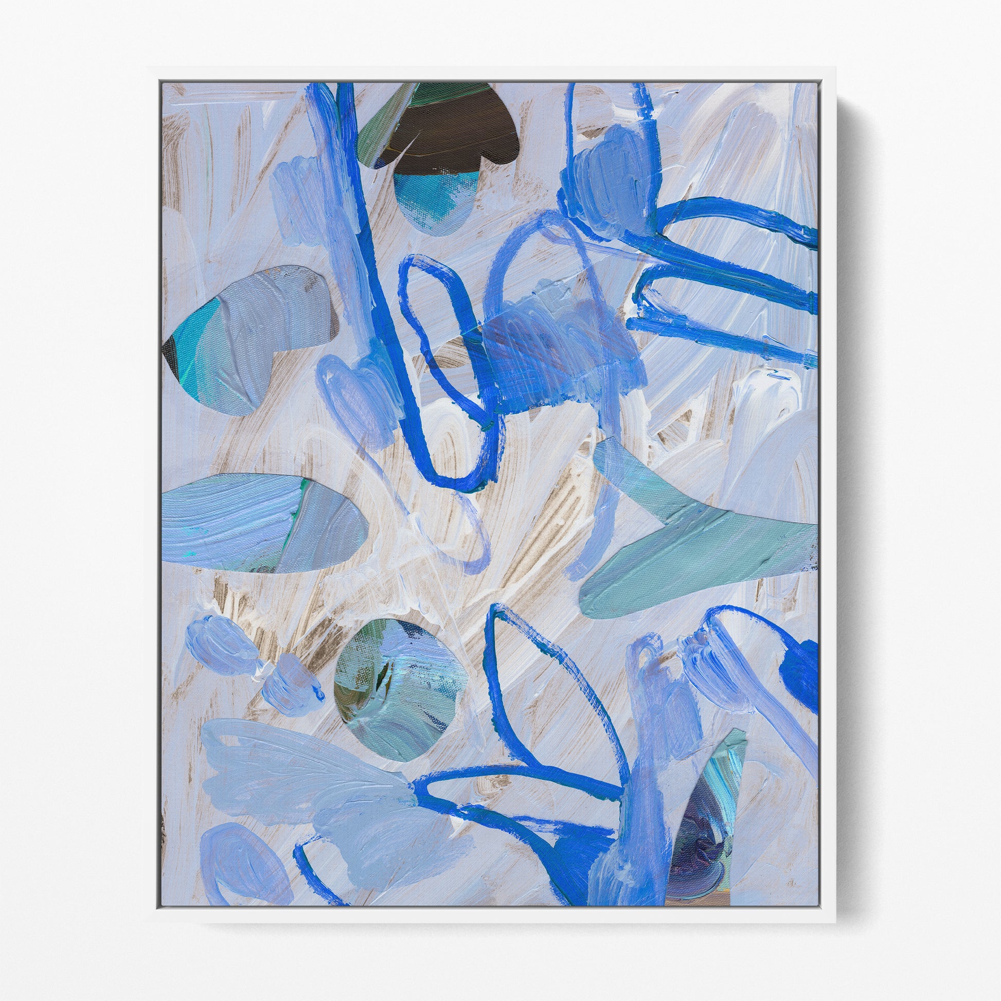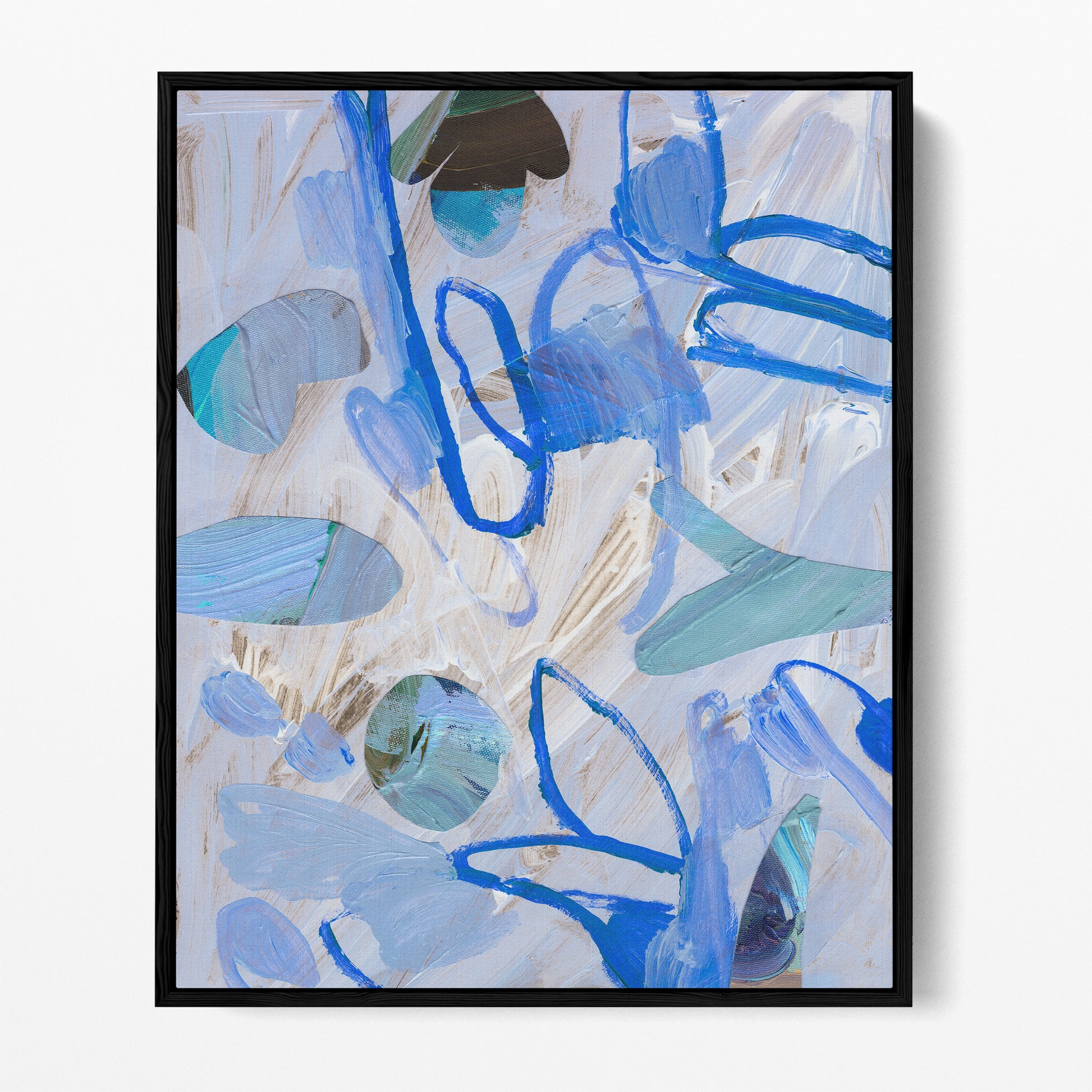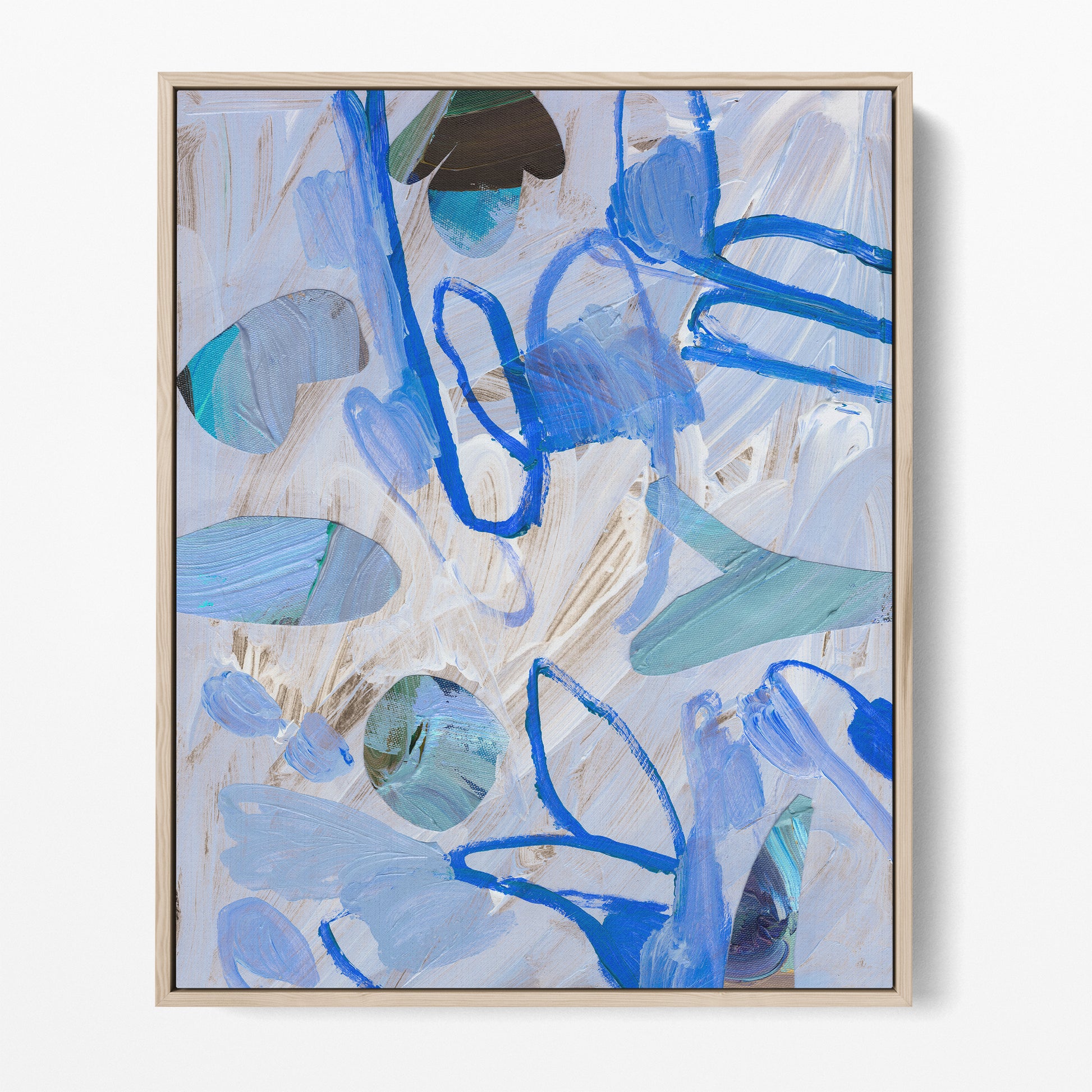 Blue tones in a cut-out collage Art Print set with a soft neutral blue background.