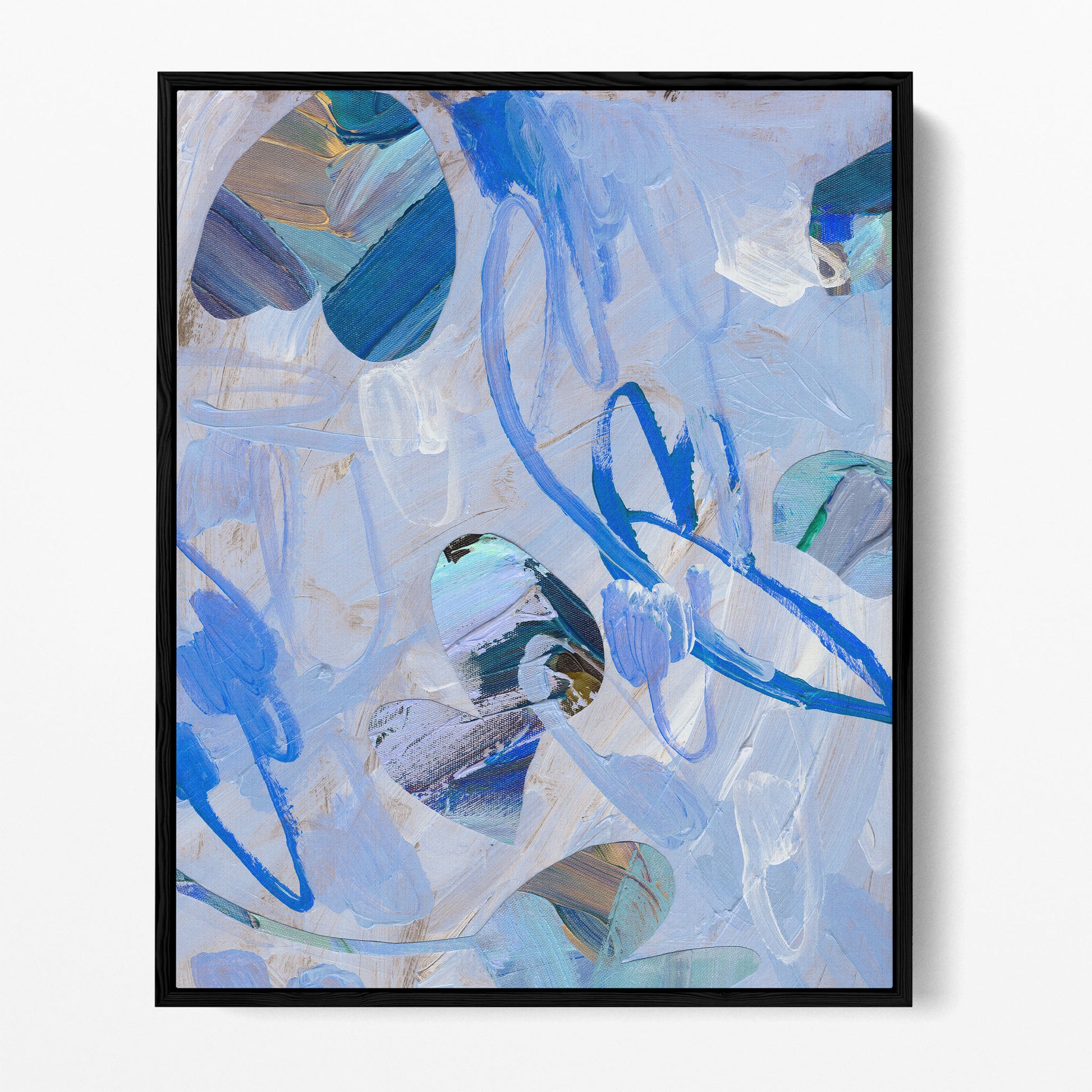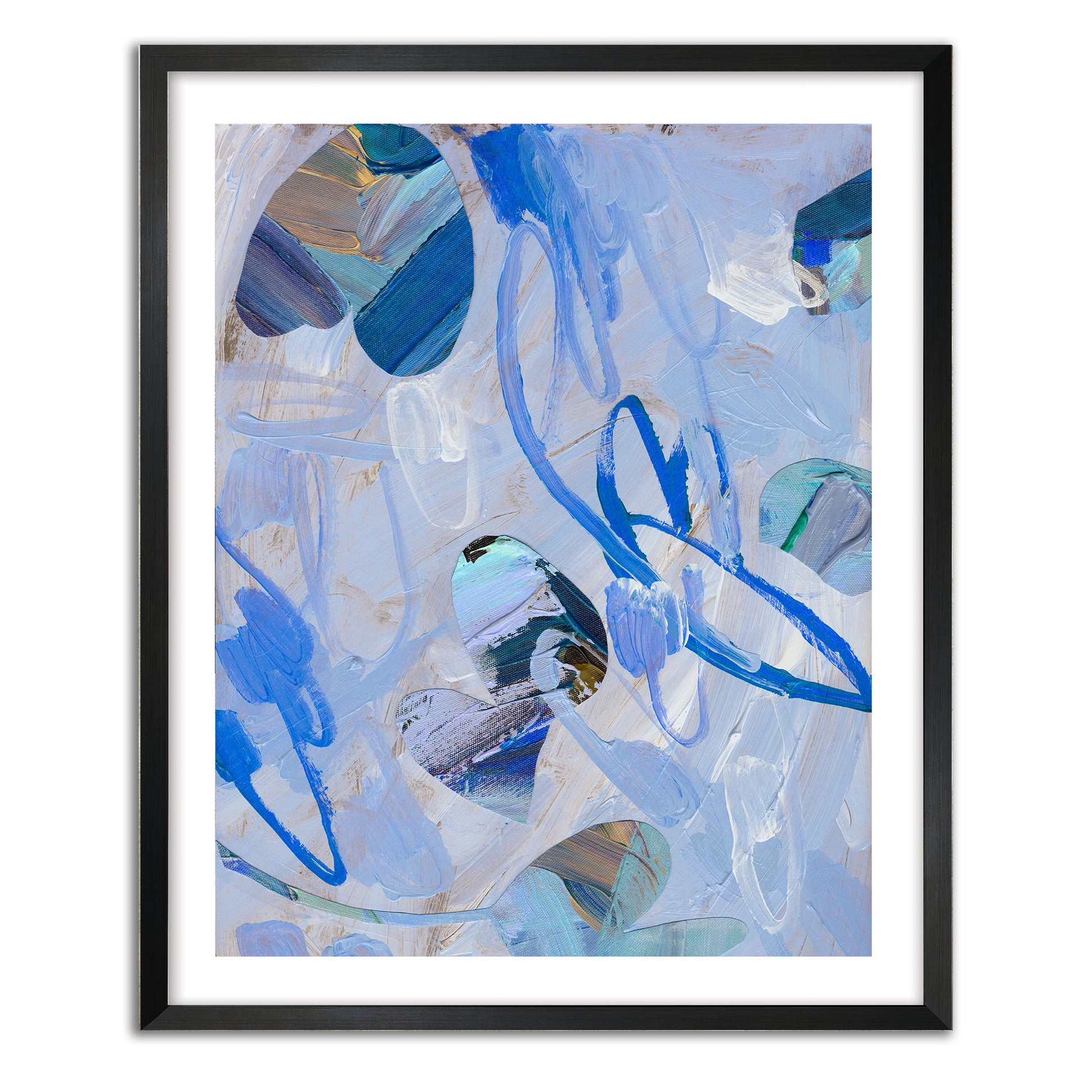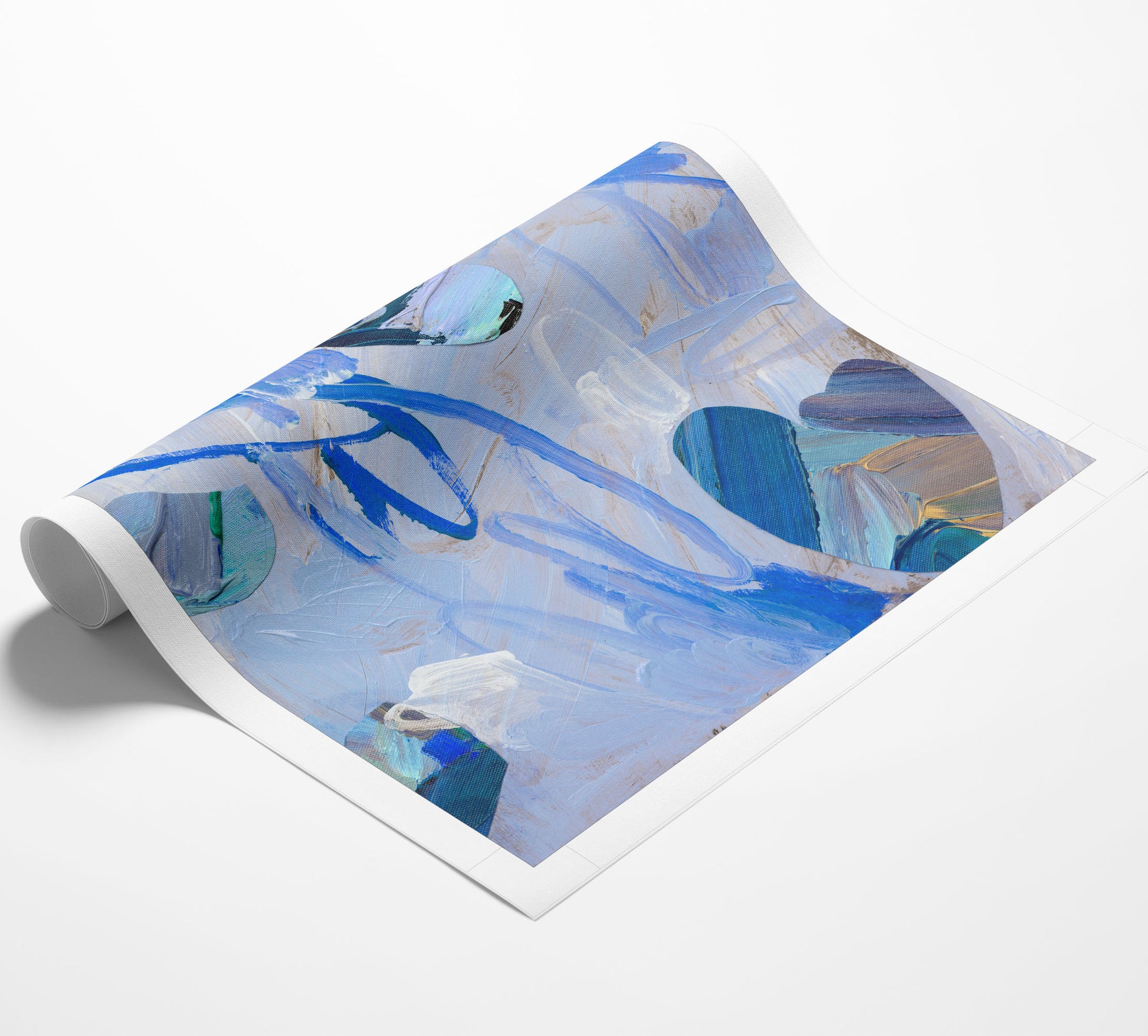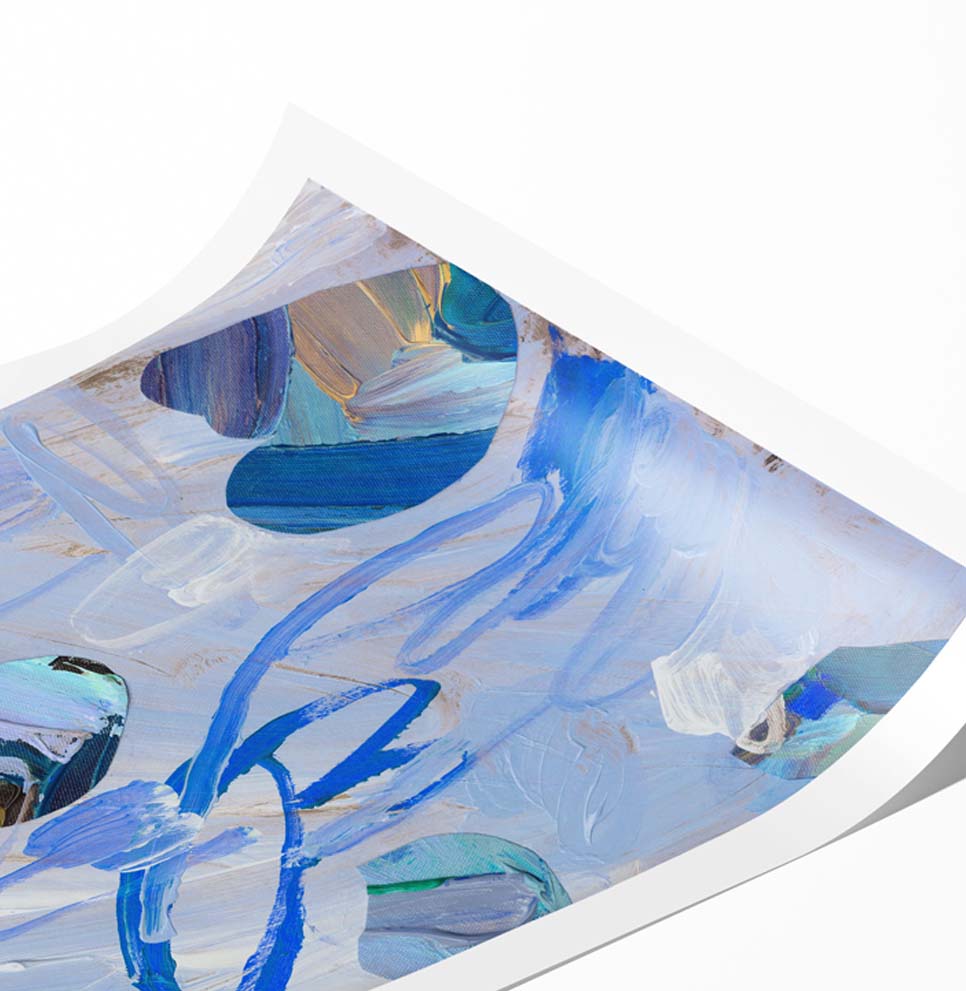 Blue tones in a cut-out collage Art Print set with a soft neutral blue background.