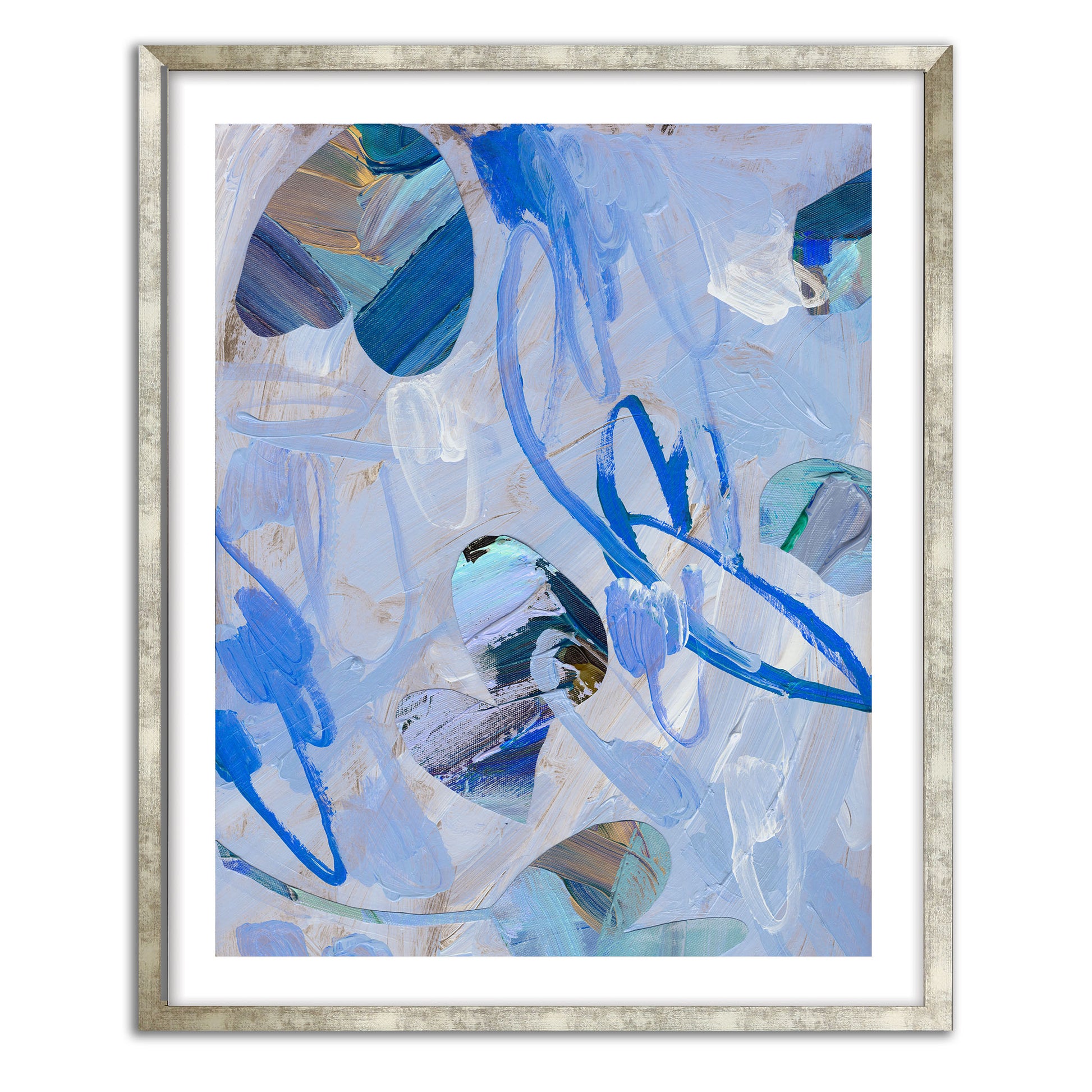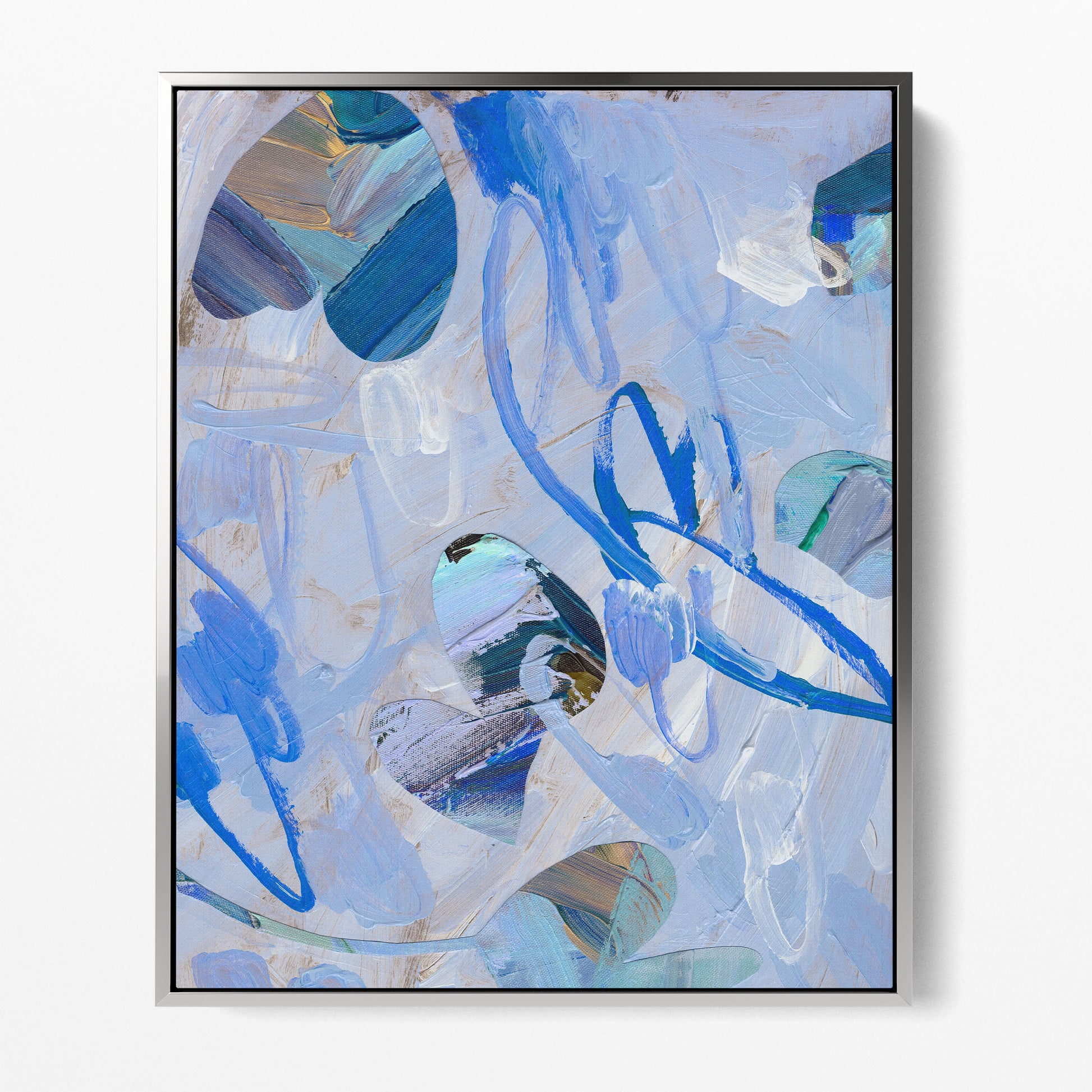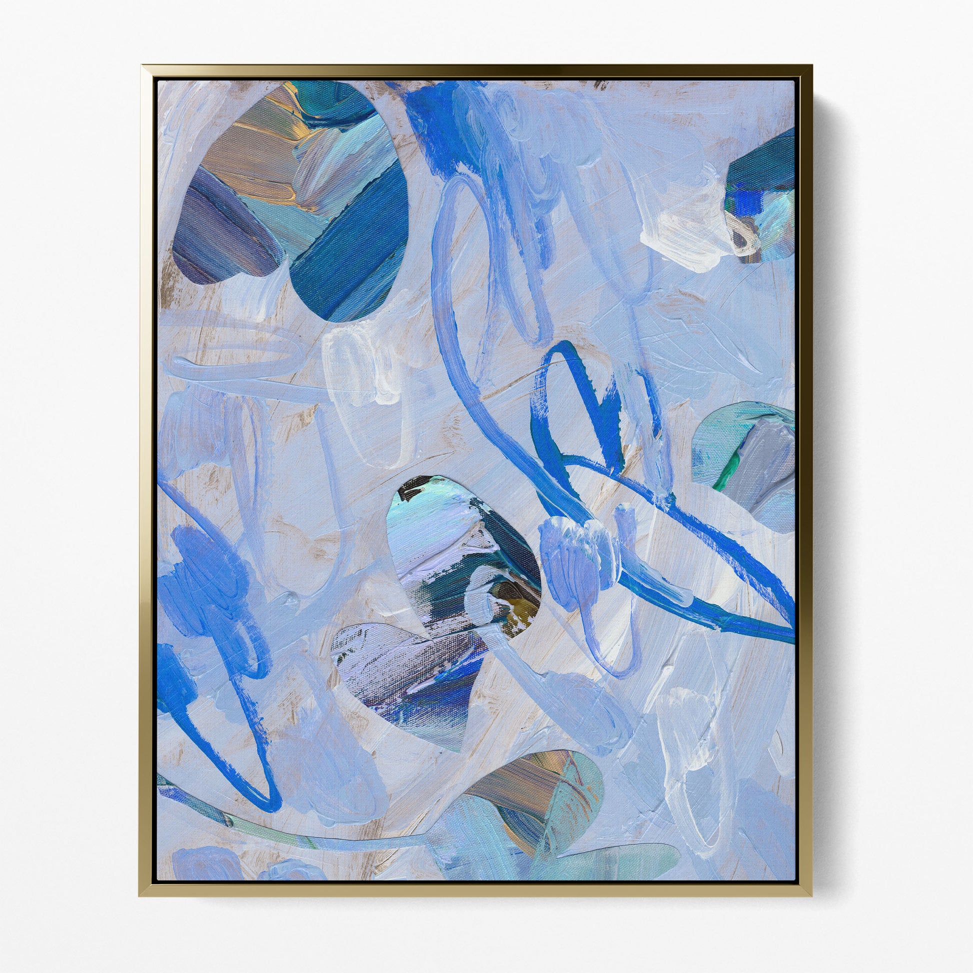 Blue tones in a cut-out collage Art Print set with a soft neutral blue background.